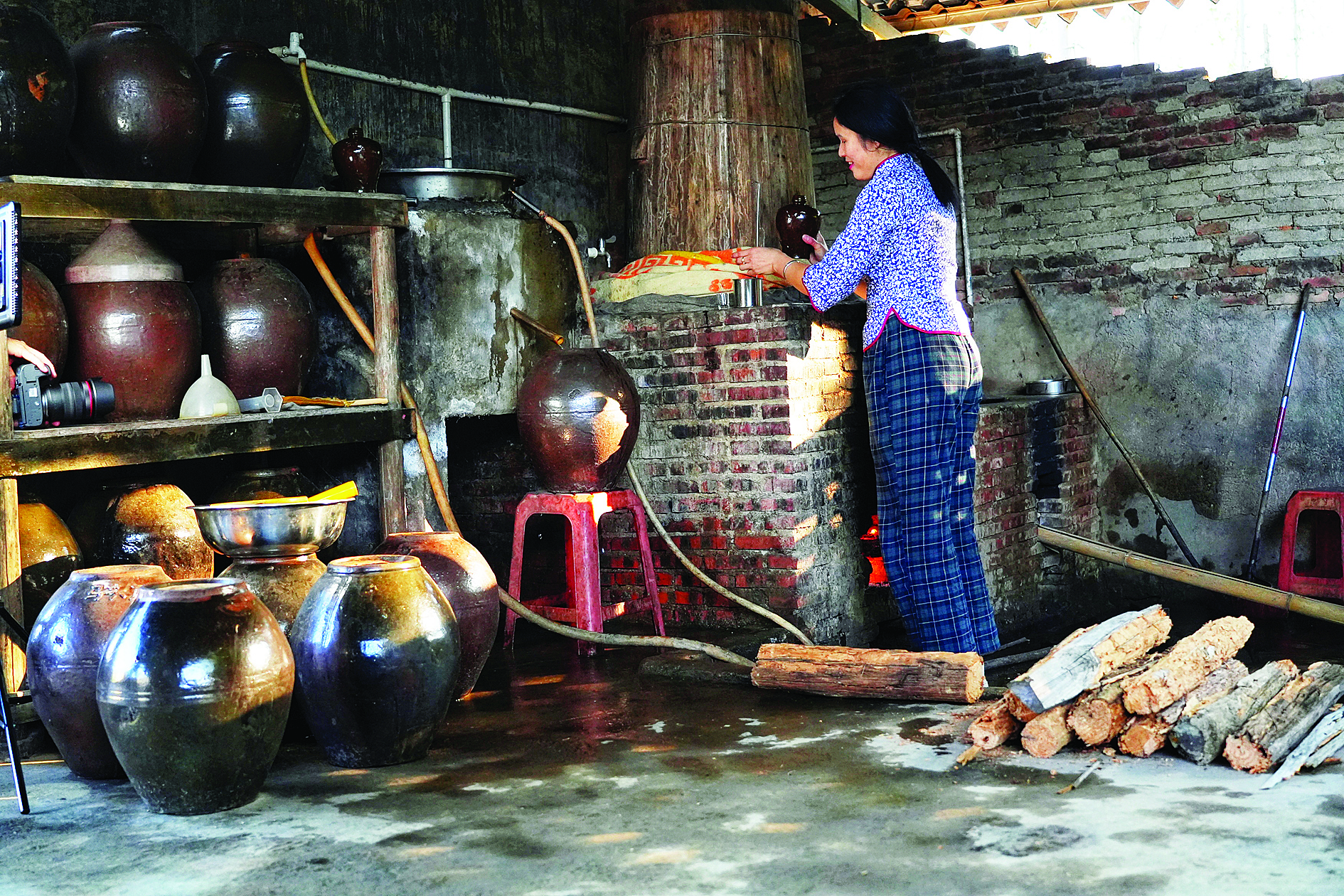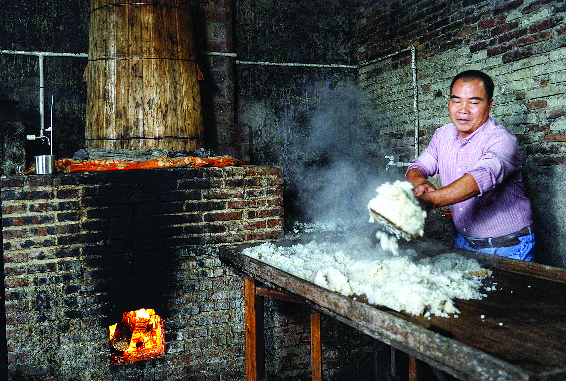 選用羅浮山下出產(chǎn)的大米,加入山泉水,用柴火鍋蒸熟;接著將整鍋香噴噴的米飯倒在木桌上,攤開(kāi)攪勻,把酒曲壓散成粉狀,與熟米飯拌勻,再裝到干凈的瓷罐中,用紗布蓋上封口,加蓋密封發(fā)酵;隨后開(kāi)始釀酒,將鐵鍋洗干凈放于土灶,把發(fā)酵后的酒曲跟米飯放入飯甑內(nèi),架上木制釀酒設(shè)備,用濕紗布密封鐵鍋與釀酒設(shè)備接觸的邊沿位置;加入冷水,然后開(kāi)始柴火慢燒……透明酒液就像涓涓細(xì)流一樣,從一根連接木制釀酒設(shè)備的木管流到接酒的缸里。