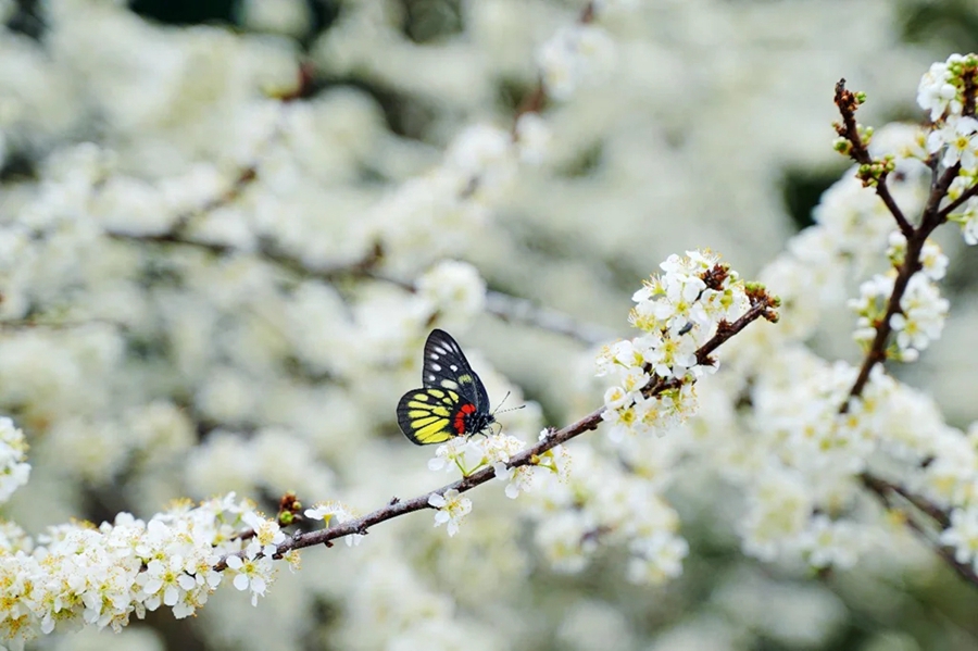 五顏六色的蝴蝶在花叢中飛舞,裝點著這一片雪白的花海。