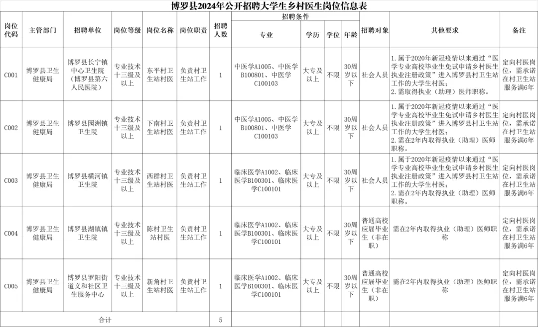 為解決我縣鄉(xiāng)村醫(yī)生緊缺的問題,改善我縣鄉(xiāng)村醫(yī)生人才隊(duì)伍結(jié)構(gòu),提高醫(yī)務(wù)工作者整體素質(zhì),根據(jù)《廣東省事業(yè)單位公開招聘人員辦法》(粵府令第301號(hào))《廣東省衛(wèi)生健康委辦公室關(guān)于加快推進(jìn)大學(xué)生鄉(xiāng)村醫(yī)生專項(xiàng)編制保障和公開招聘工作的通知(粵衛(wèi)辦基層函〔2024〕7號(hào))》精神,貫徹落實(shí)“鎮(zhèn)招村用”有關(guān)要求,經(jīng)博羅縣衛(wèi)生健康局黨組研究決定,會(huì)同縣醫(yī)共體總院面向社會(huì)公開招聘大學(xué)生鄉(xiāng)村醫(yī)生共5名。具體公告如下: