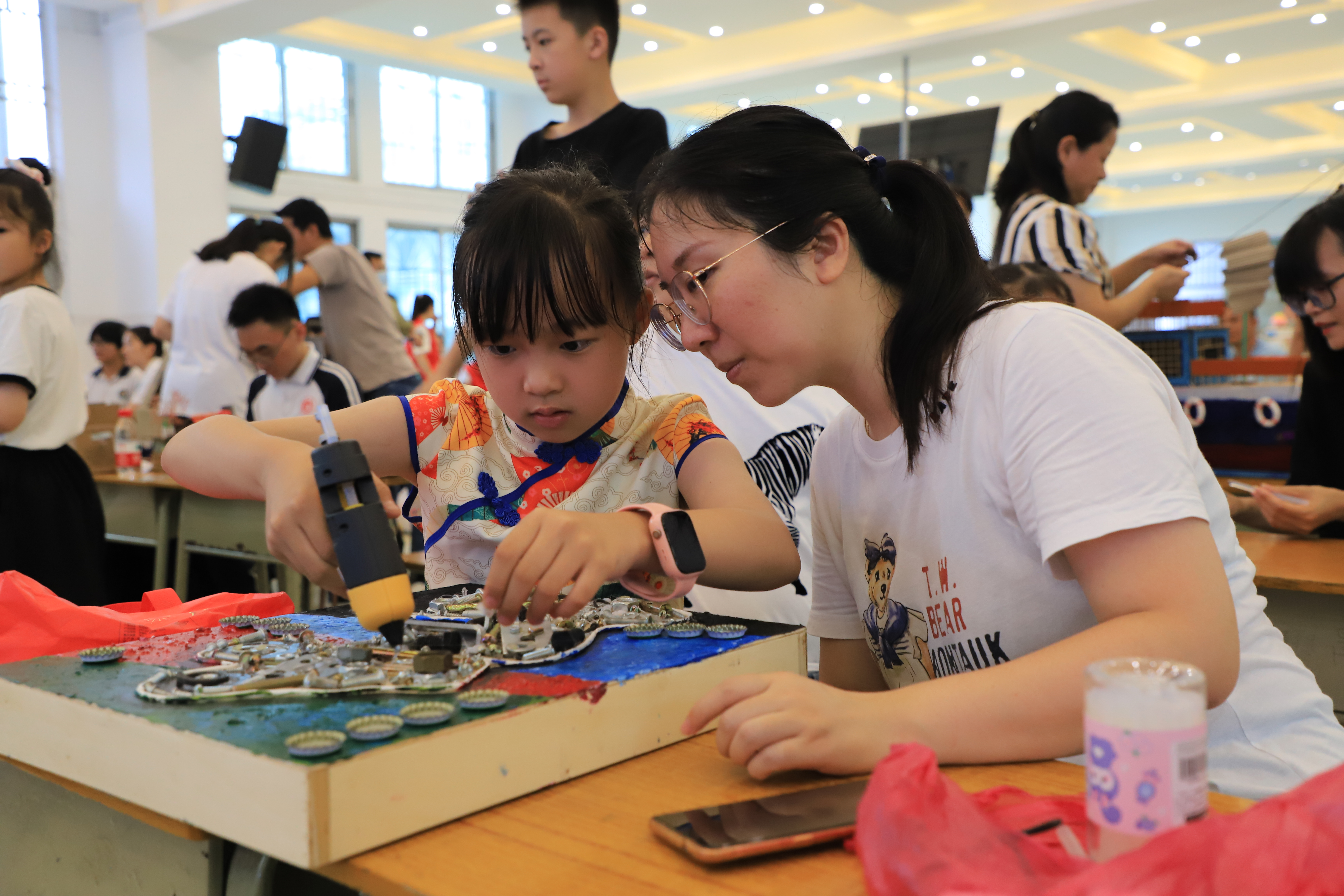老師指導學生制作垃圾分類宣傳作品。