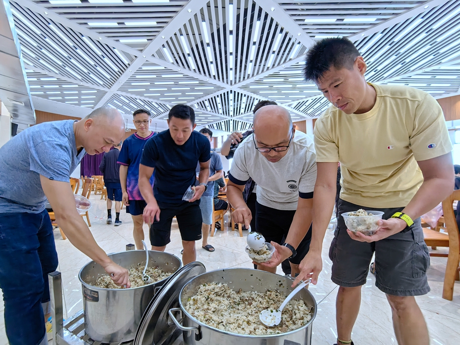 “臘肉丁、糯米、鵝肉、竹筍、冬菇……”在寮仔村的禮堂里,一鍋色香味俱全的“龍船飯”讓粵港同胞大快朵頤。“再澆上一點(diǎn)醬油,就能為這碗‘龍船飯’注入靈魂。”寮仔村村委會(huì)副主任李柏烽說,吃龍船飯是每年“龍舟季”的必備節(jié)目,不僅有風(fēng)調(diào)雨順、五谷豐登等良好寓意,更彰顯了當(dāng)?shù)厝罕妼?duì)扒龍舟習(xí)俗的熱情。