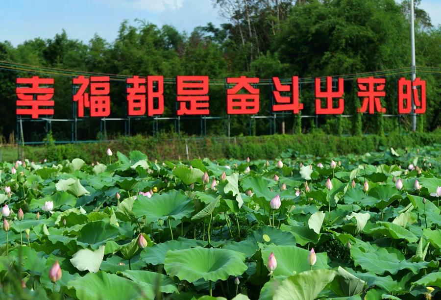 “幸福都是奮斗出來的”,顯眼紅色的大字和綠色的荷花交相輝映。三嘉村是廣東省“百千萬(wàn)工程”首批典型村。