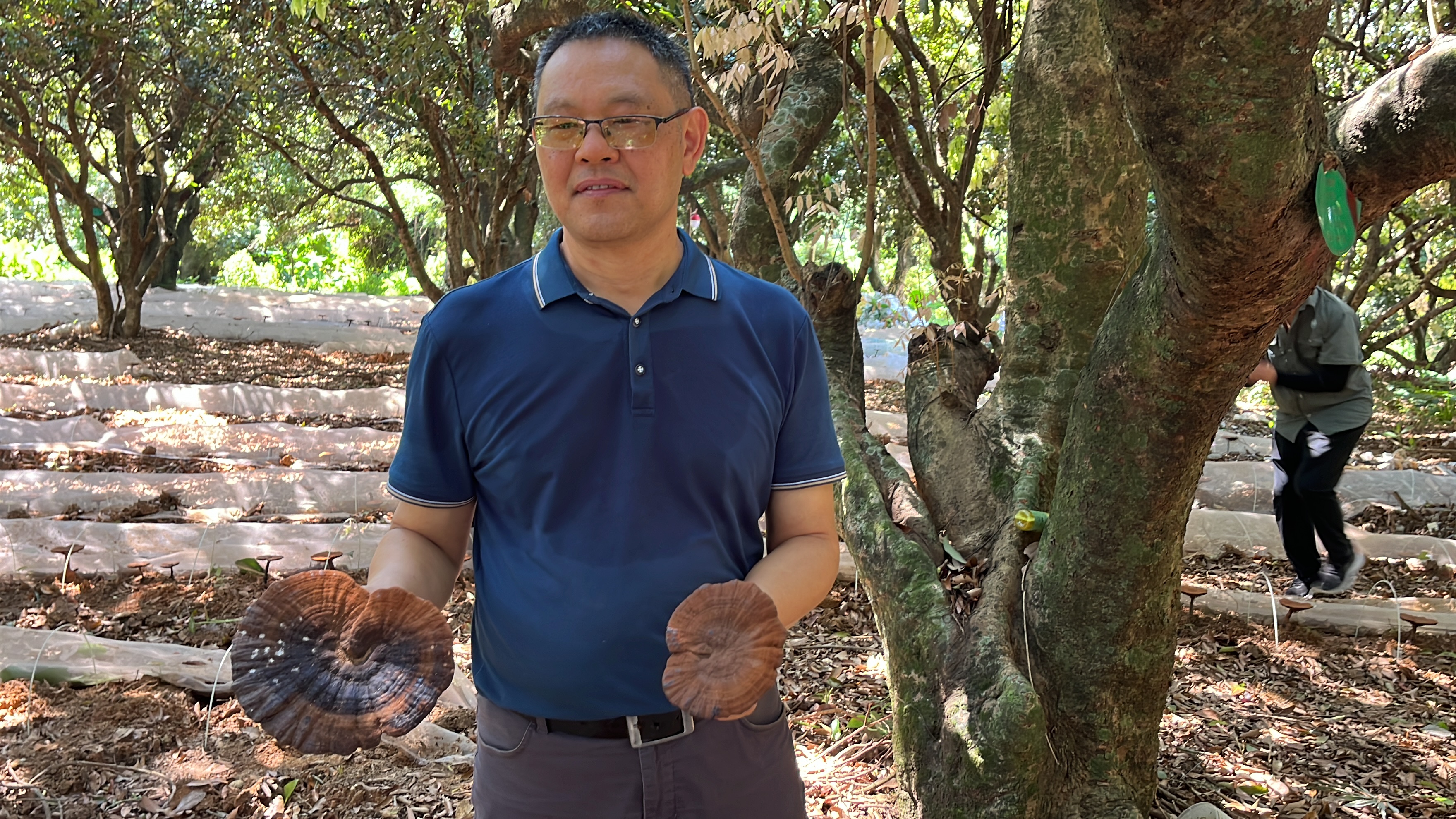 高級工程師林永標(biāo)指導(dǎo)良田村發(fā)展林下經(jīng)濟(jì),在古荔枝林下種靈芝。