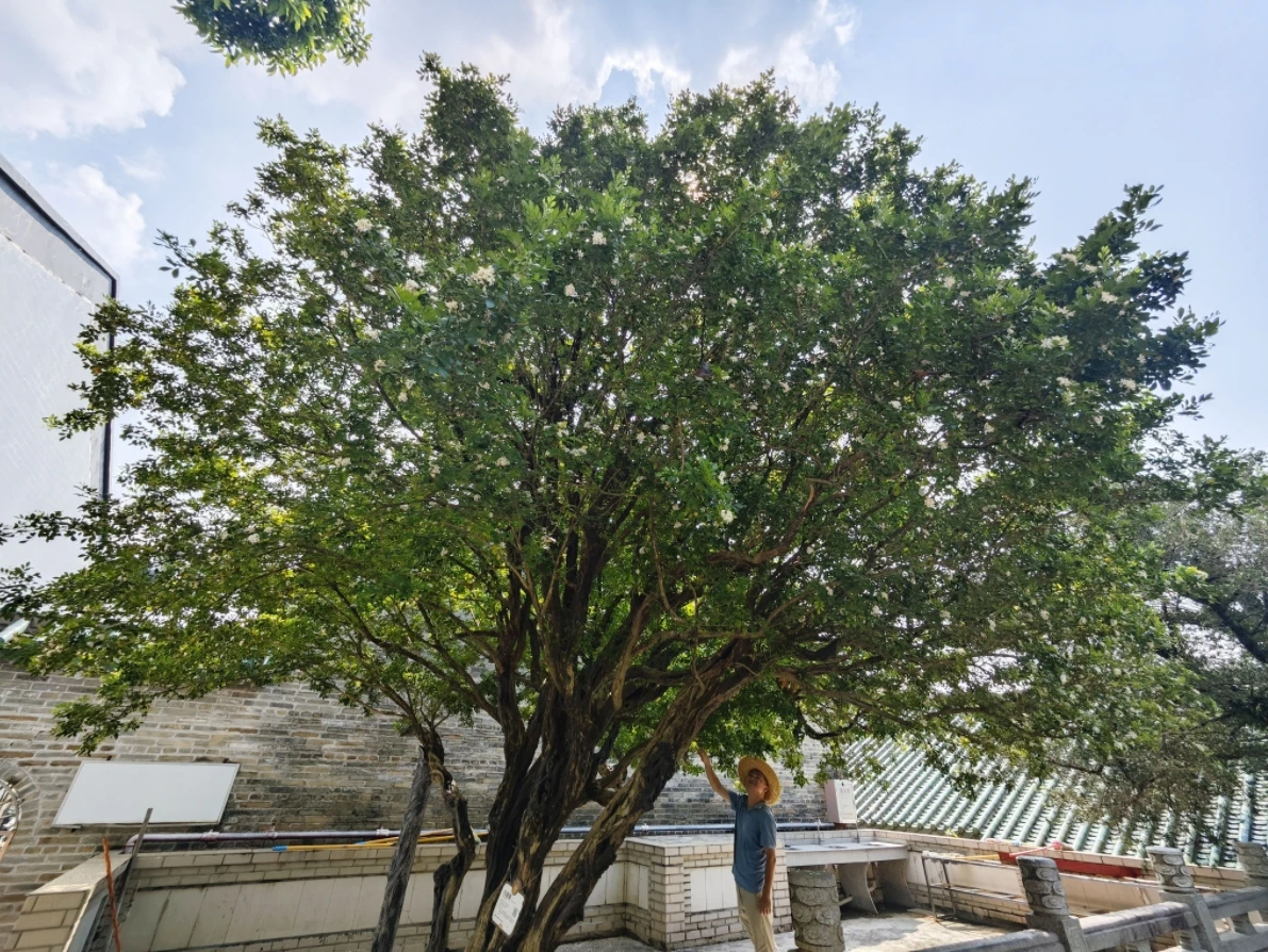 廣東省林業(yè)局、廣東省古樹名木信息管理系統(tǒng)顯示,這株九里香為國家一級古樹,樹齡已達759年。相傳為南宋年間觀內一位道士所種。每當秋風至,白花競相綻放,香氣襲人。