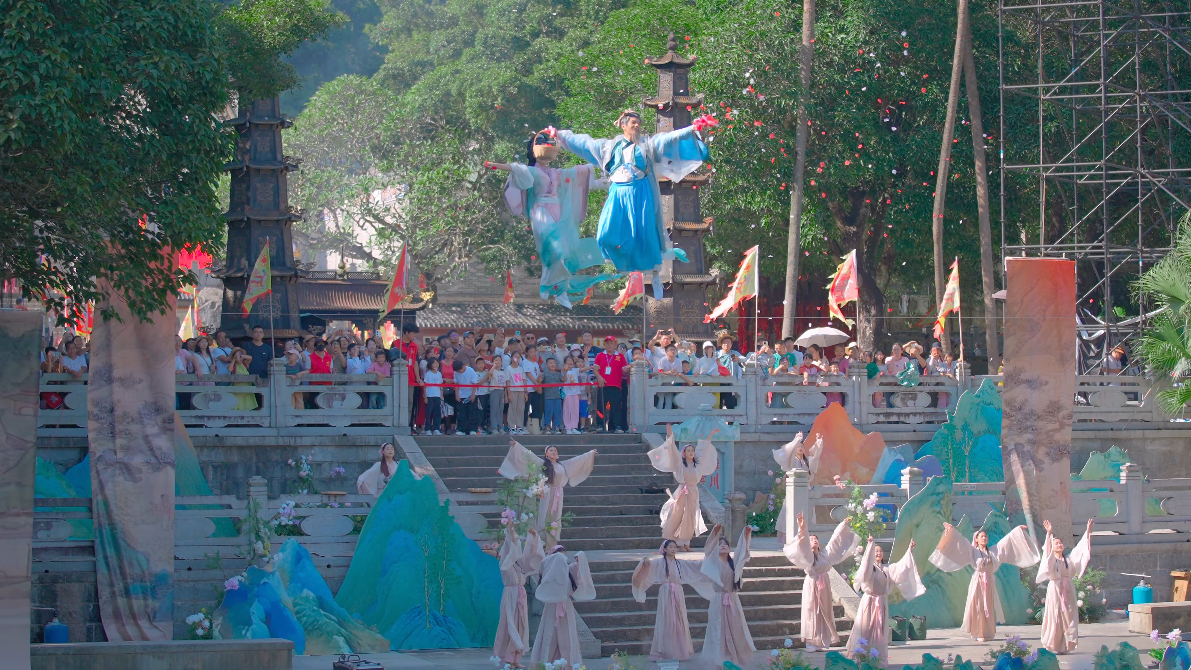 舞臺上運(yùn)用羅浮山元素的水墨畫布,高掛懸垂,與白蓮湖、沖虛古觀一起營造出一種具有強(qiáng)烈的視覺碰撞感。遠(yuǎn)處縹緲的飛云頂,近處婆娑的樹木,眼前的澄綠湖水,沖虛古觀中飄來的陣陣熏香,為情景劇增添了濃濃氛圍,身在景區(qū),而融入劇情中。