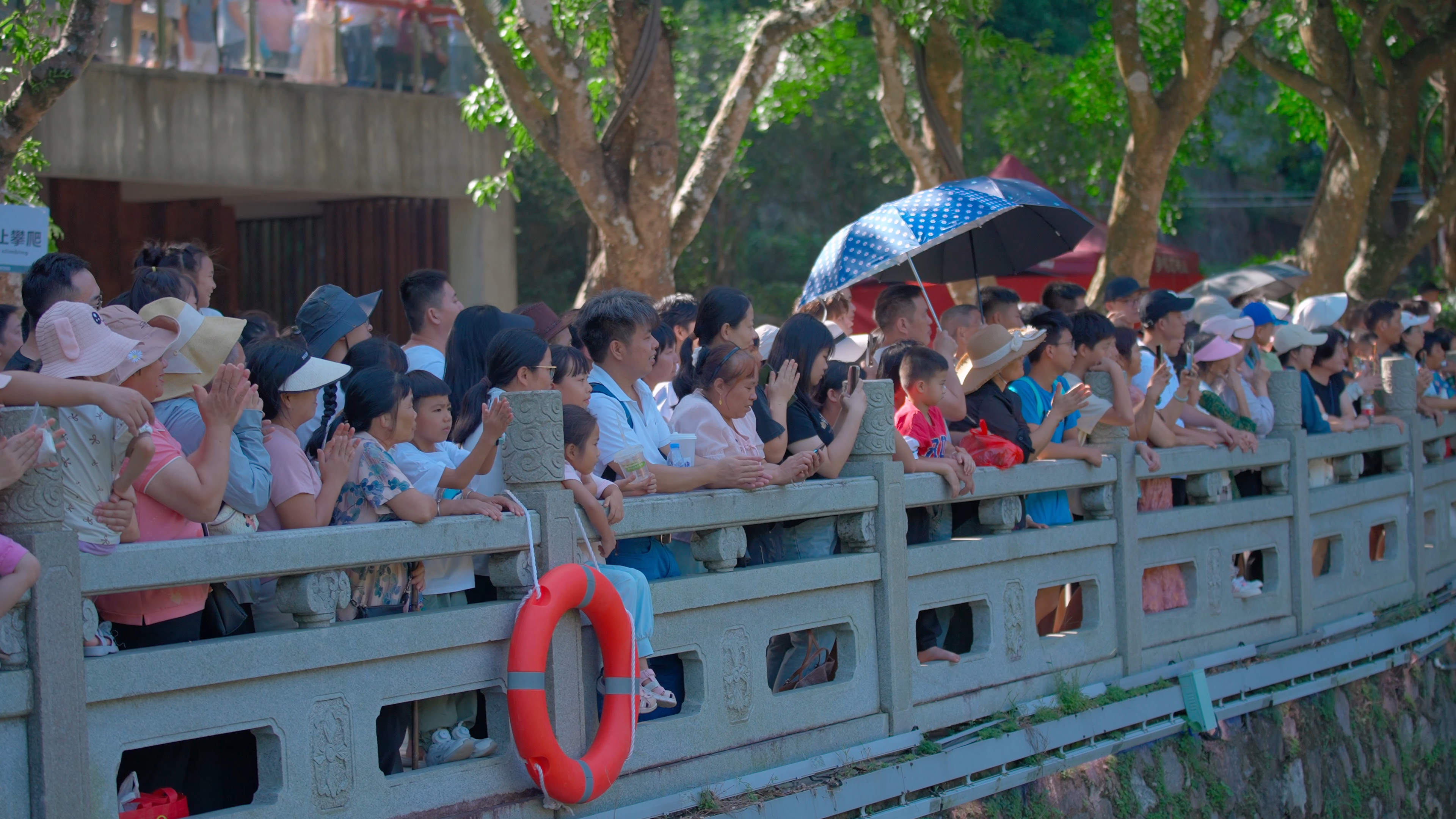 游客們在羅浮山白蓮湖畔欣賞原創(chuàng)情景劇《道醫(yī)濟(jì)世》。
