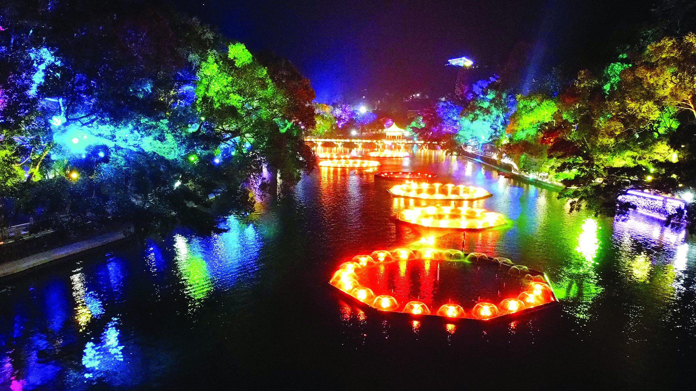 景區(qū)燈光秀絢麗多彩。