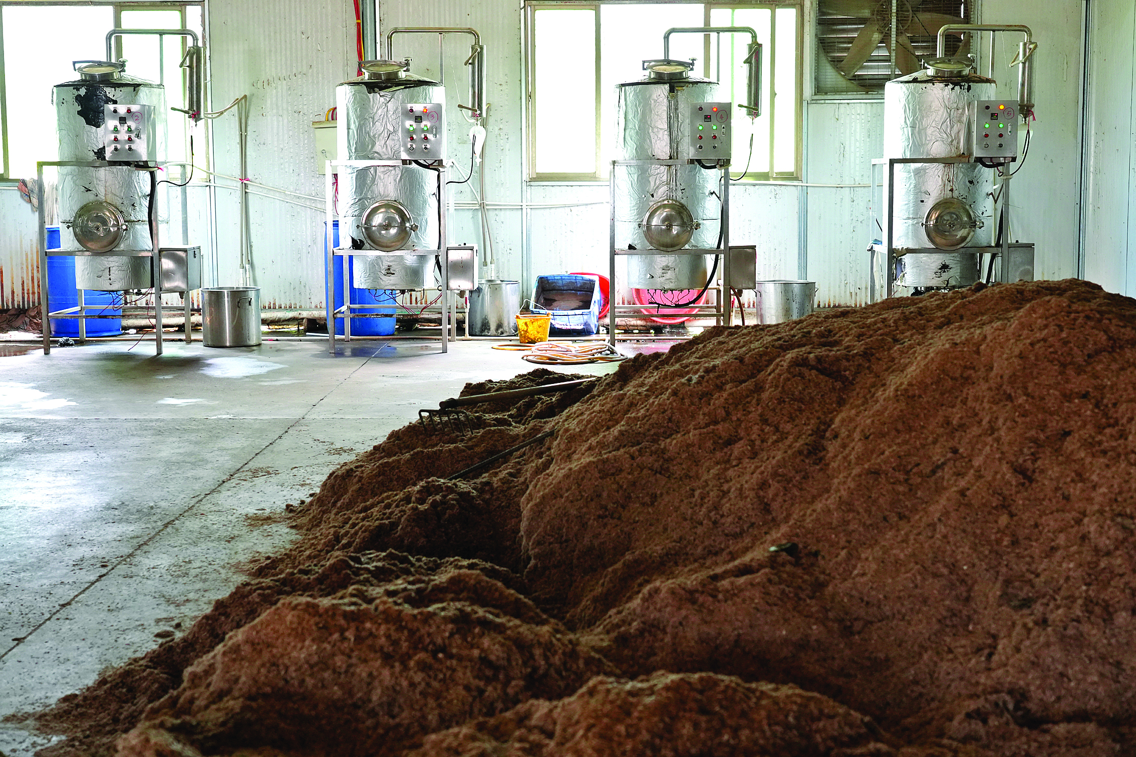 山腳下的生產(chǎn)車間內(nèi),層層堆疊著剛砍下不久的沉香樹干,工人們忙著對樹干進行切割、破裂。另一頭的加工車間內(nèi),沉香碎屑如小山丘,空氣中彌漫著陣陣濃郁的沉香木屑味,一旁的自動化機械設備不停運轉(zhuǎn),經(jīng)過幾十個小時后,沉香碎屑將蛻變成晶瑩剔透的沉香純露,或被加工成香氣濃郁、色澤醇厚的沉香精油。