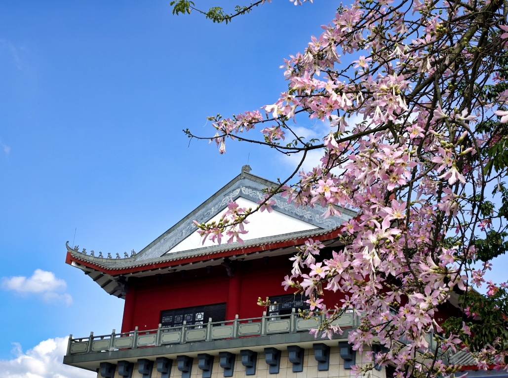 在羅浮山文化廣場,美麗異木棉開得層層疊疊,微風拂過,花瓣輕盈飄落,似粉雪飛舞,翠綠的葉片、粉嫩艷麗的花朵與藍天白云相互映襯,一下子甜蜜了整個秋天。花瓣悠然飄落,像是每年如約而至的浪漫,走過、駐足、再回首,粉色的青春留在每個人的心里。