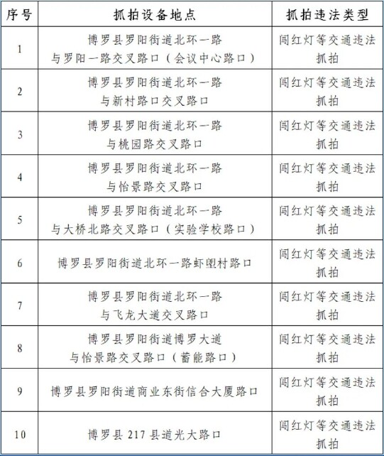 11月8日,惠州交警發(fā)布《關(guān)于公布固定式交通技術(shù)監(jiān)控設(shè)備地點的公告》。博羅羅陽北環(huán)一路沿線交叉路口等路段將新增10套“電子警察”設(shè)備,主要用于闖紅燈等交通違法抓拍,希望過往駕駛?cè)俗⒁庵斏黢{駛、安全出行。