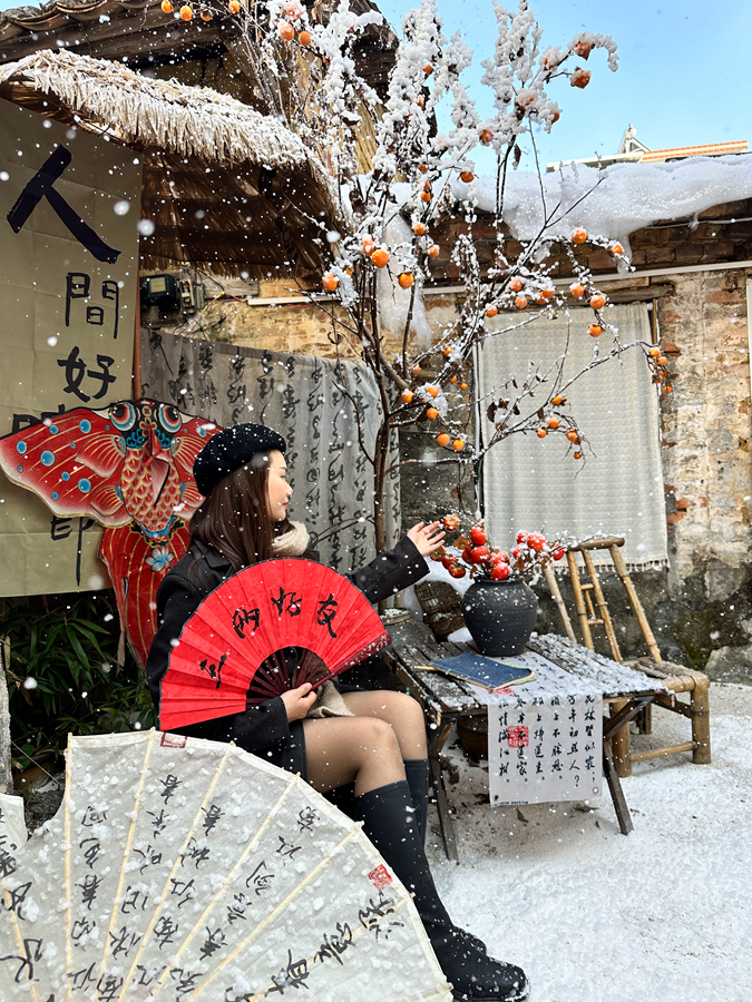 “我是在社交媒體上刷到這里的,今天孩子生日,特意帶她來拍照打卡。”從龍門縣永漢鎮(zhèn)驅(qū)車前來的游客鐘俊豪說,雪與柿子、書法等傳統(tǒng)文化元素搭配構建起來的場景很有過年的氛圍。“以后會跟身邊的朋友‘安利’這里,從永漢過來也只要40分鐘,很適合周末來打卡。”