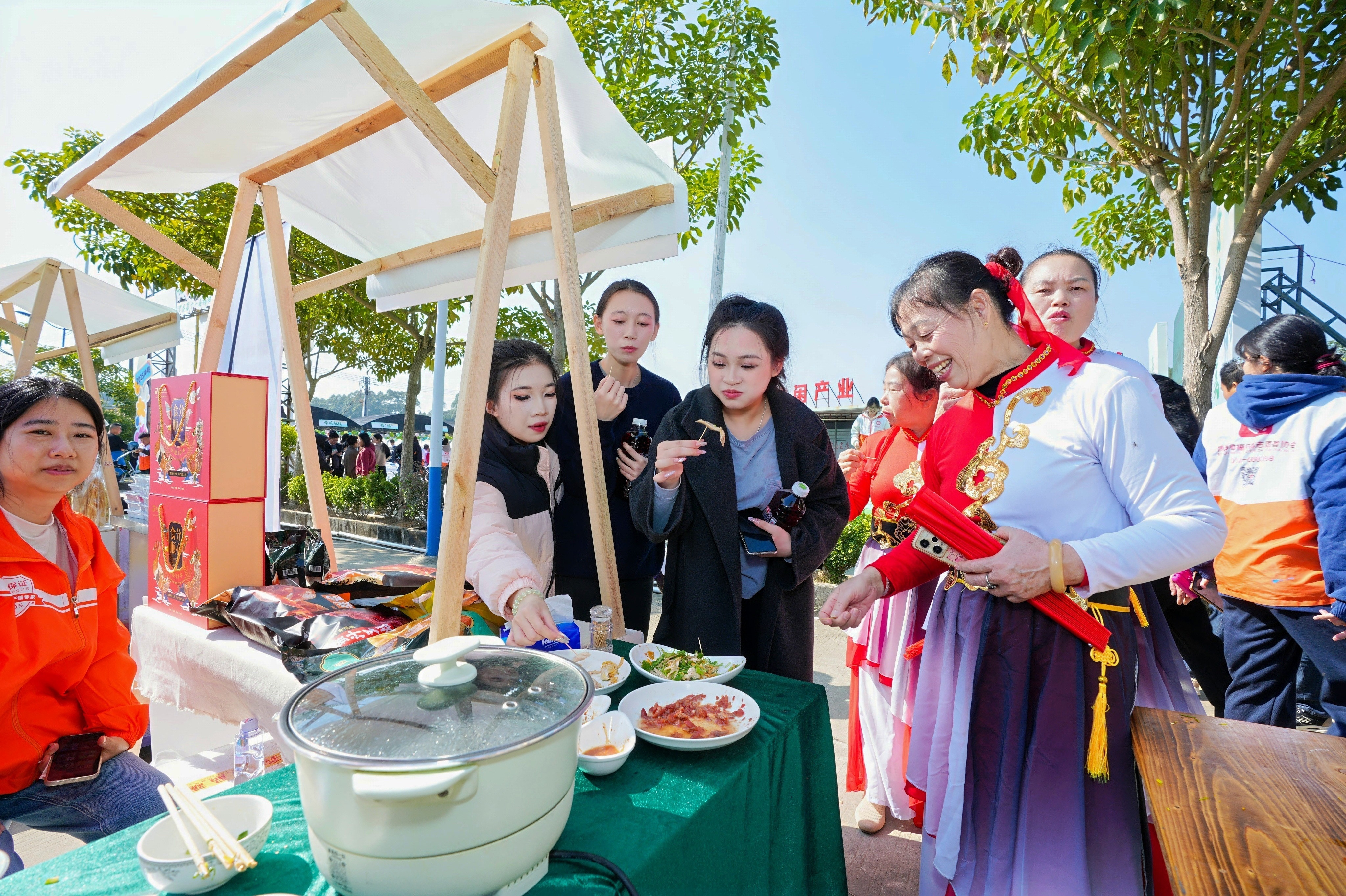 舞臺上,醒獅、變臉、手鼓等表演精彩紛呈。在互動游戲區(qū),主辦方貼心準(zhǔn)備了一批新鮮“菜心花”供游客拍照。蒙眼敲鼓、投“福”等互動游戲,吸引眾多游客參與。在農(nóng)產(chǎn)品展銷區(qū),農(nóng)特產(chǎn)品琳瑯滿目,眾多游客品嘗購買。