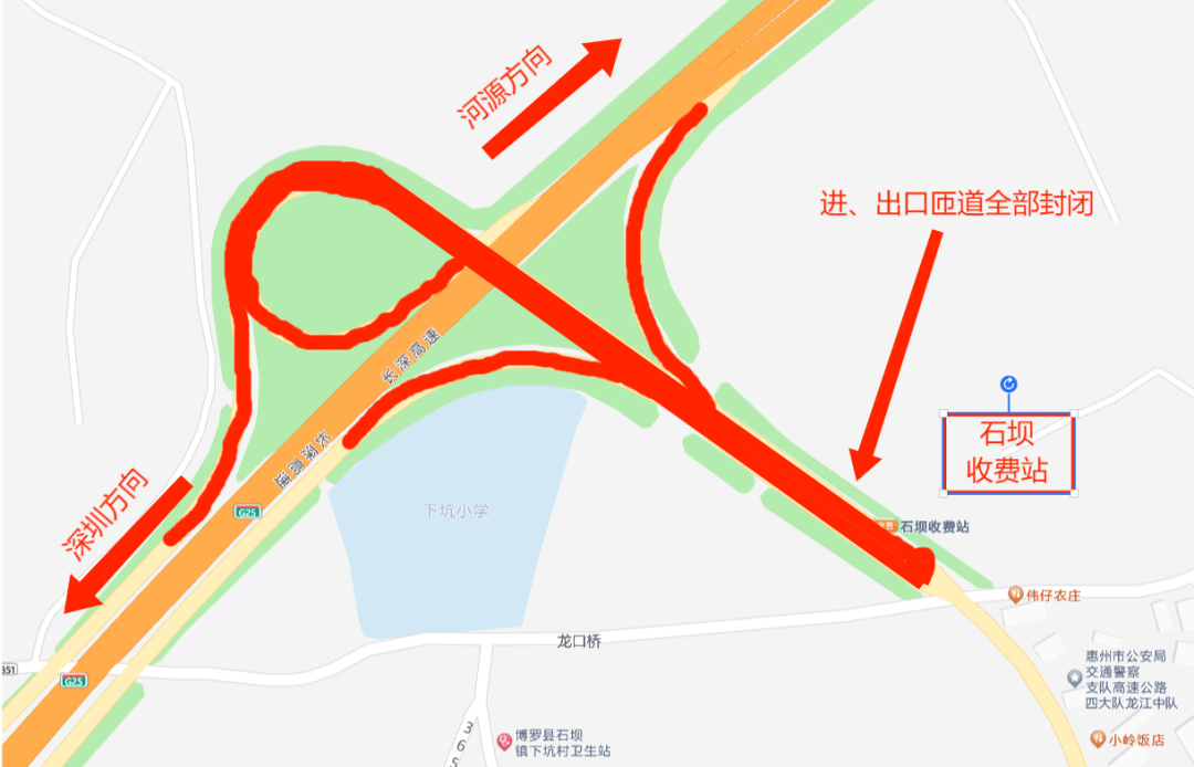 (二)管制措施。長深高速公路惠州段(惠河高速公路)石壩收費(fèi)站進(jìn)、出口匝道全部封閉,禁止車輛通行。