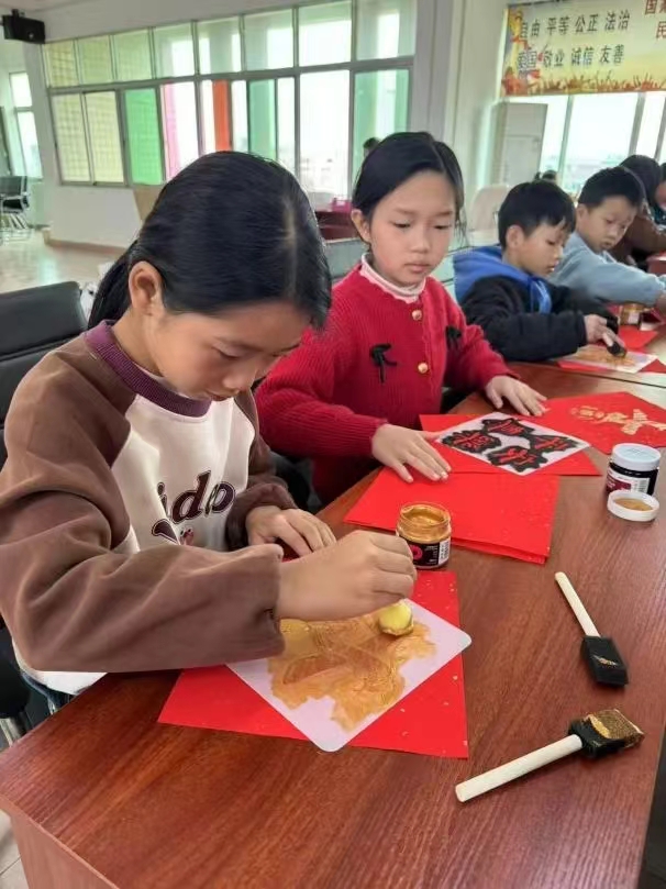 隨后,非遺拓“福”字的環(huán)節(jié)開(kāi)始。孩子們拿起金色、黑色的顏料,在紅紙上拓上“福”字,一幅幅喜慶鮮艷的“福”字便呈現(xiàn)在眼前。