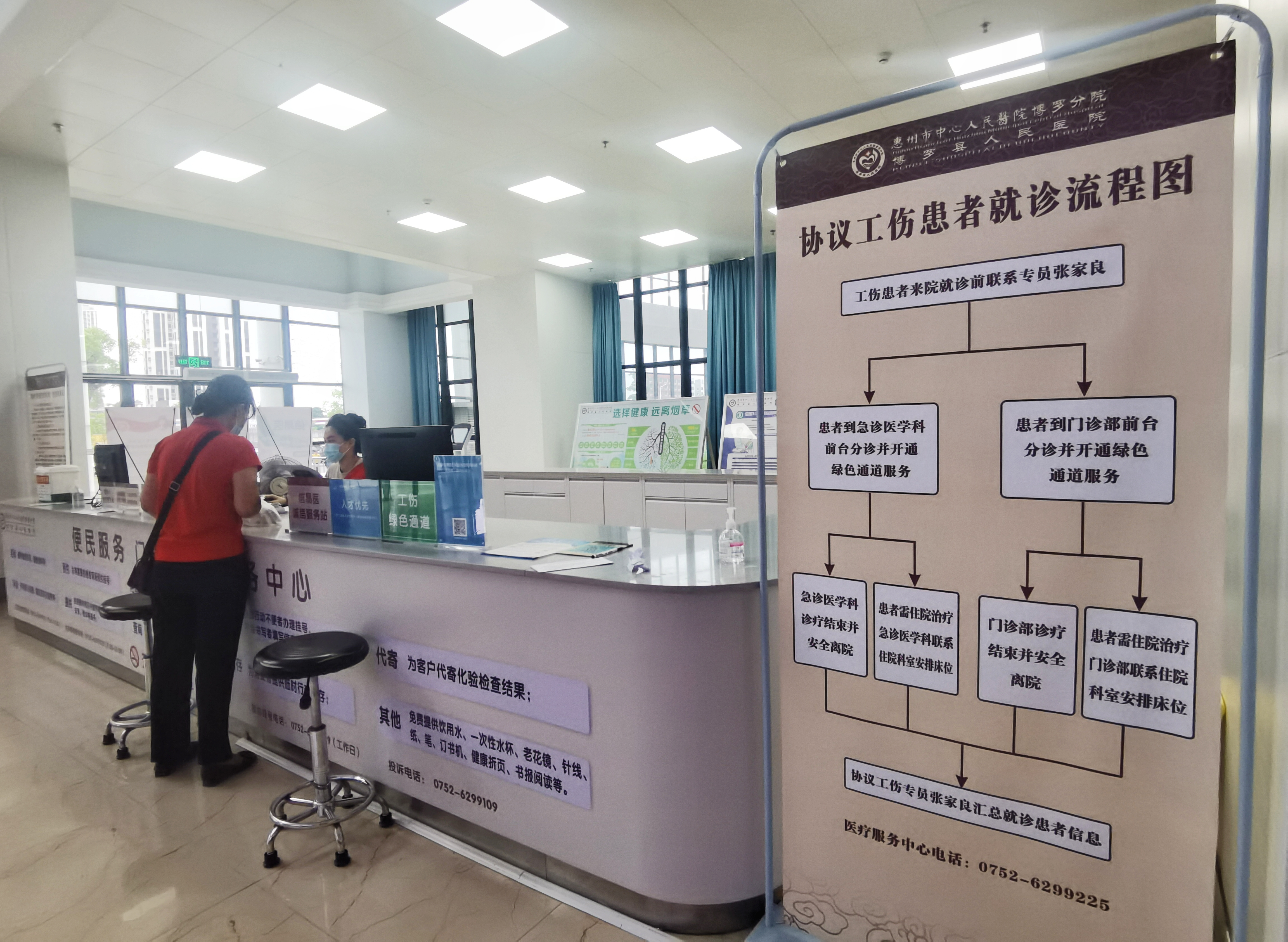 縣人民醫(yī)院在顯眼處擺放企業(yè)職工工傷“綠色通道”就診指引。 惠州日?qǐng)?bào)記者朱麗婷 攝