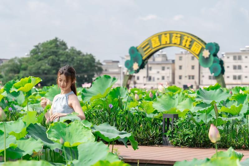 游人在荷花園打卡。 石壩鎮(zhèn)供圖