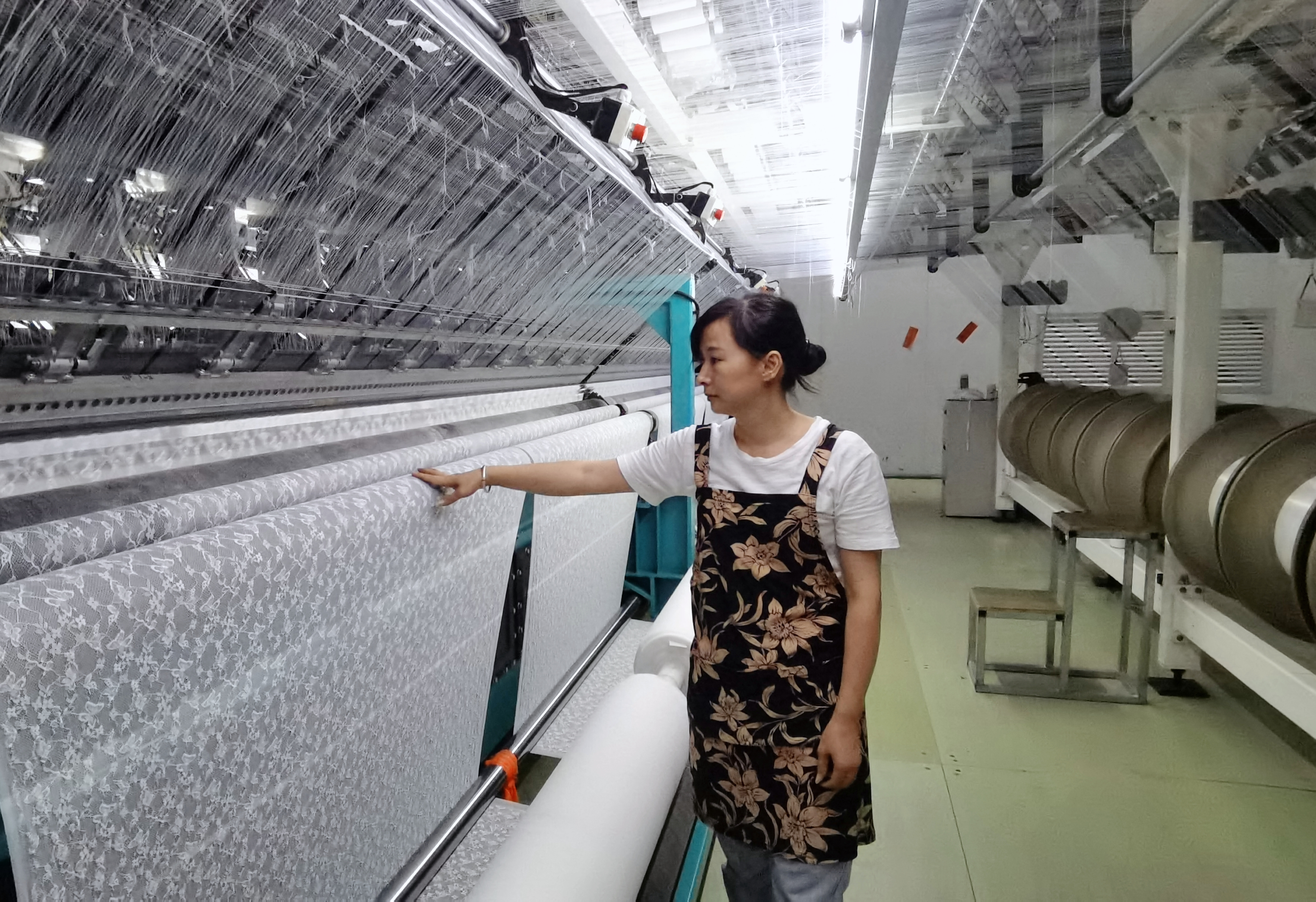 位于園洲鎮(zhèn)的廣東中康織繡科技有限公司生產車間里,工人正檢查蕾絲生產情況。惠州日報記者朱麗婷 攝