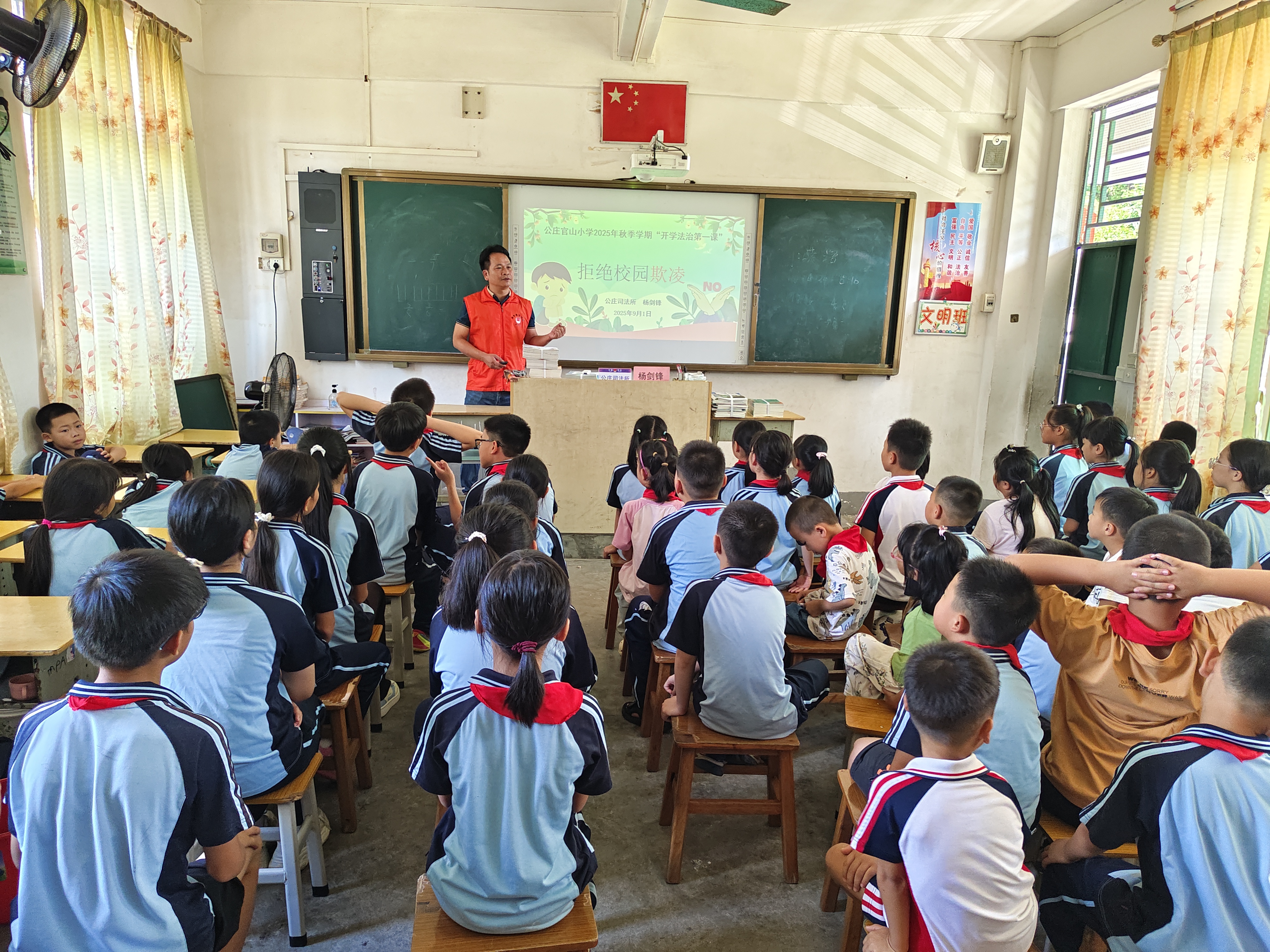 各基層司法所也積極響應(yīng)。9月1日,公莊司法所負(fù)責(zé)人、官山小學(xué)法治副校長(zhǎng)楊劍鋒走進(jìn)學(xué)校,以《拒絕校園欺凌》為主題,通過(guò)典型案例剖析校園欺凌類(lèi)型、危害,系統(tǒng)講解預(yù)防機(jī)制及應(yīng)對(duì)策略,為新學(xué)年師生劃清行為邊界,構(gòu)筑校園安全法治防線。