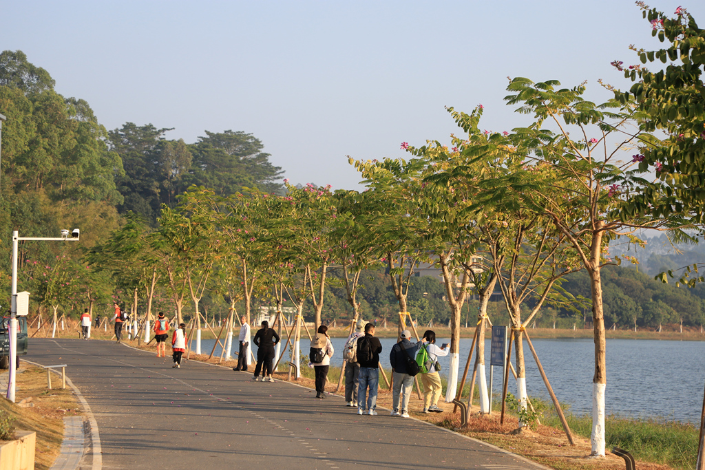 此次徒步線路全程57公里,其中約36公里綠道,18公里鄉(xiāng)道和村道,3公里機(jī)耕路,途經(jīng)長寧鎮(zhèn)、橫河鎮(zhèn)、湖鎮(zhèn)鎮(zhèn),再回到羅浮山風(fēng)景名勝區(qū)旅游文化廣場。沿途山水相依,綠美相隨,美景填滿了大家的雙眼。作為途中的“重頭戲”,“小洱海”再次出圈,不管是初來乍到,還是二次相遇,或是多次光臨,驢友們都不吝嗇贊美之詞。據(jù)悉,此次徒步活動(dòng)吸引了來自惠州、廣州、深圳、東莞、佛山、珠海、中山、上海、香港、澳門等全國各地驢友前來參與。來自深圳的谷女士帶著丈夫、兒子一家三口前來參加活動(dòng)。在“小洱海”,他們多次放慢腳步,拍照打卡。她興奮地說:“手機(jī)的內(nèi)存空間,都快要報(bào)警了。”