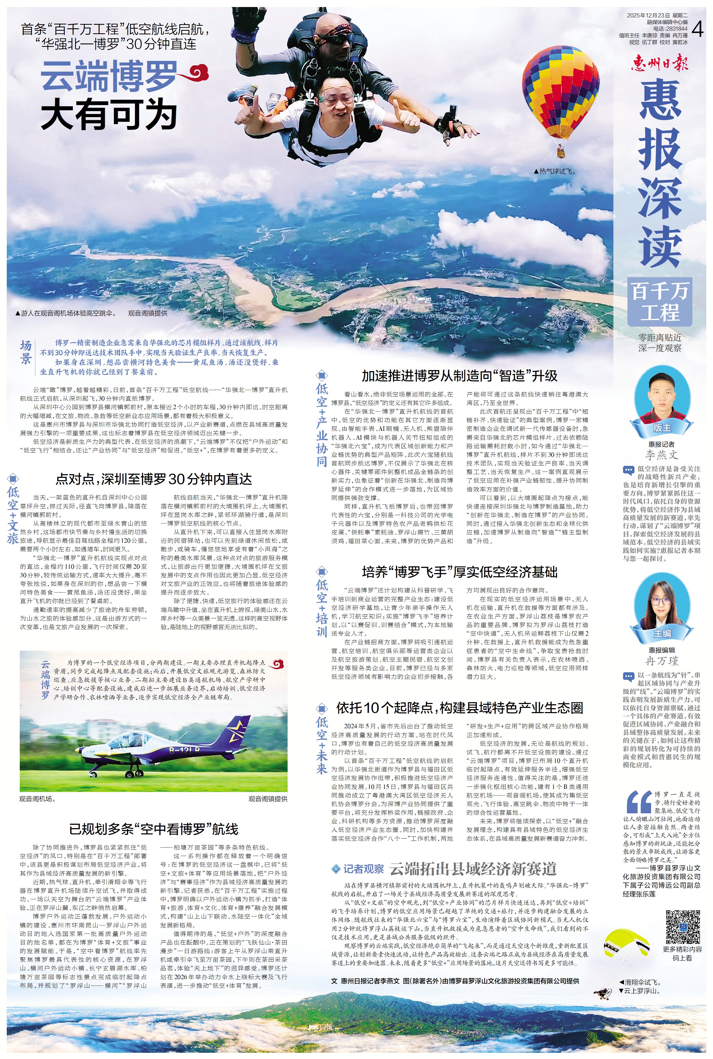 “博羅一直是徒步、騎行愛好者的聚集地。低空飛行讓人俯瞰山河壯闊,地面運動讓人親密接觸自然。兩者結合,可形成“上天入地”全方位感知博羅的新玩法,還能把分散的景點串聯(lián)成線,讓游客更全面領略博羅之美。” ——博羅縣羅浮山文化旅游投資集團有限公司下屬子公司博遠公司副總經(jīng)理張樂蓮