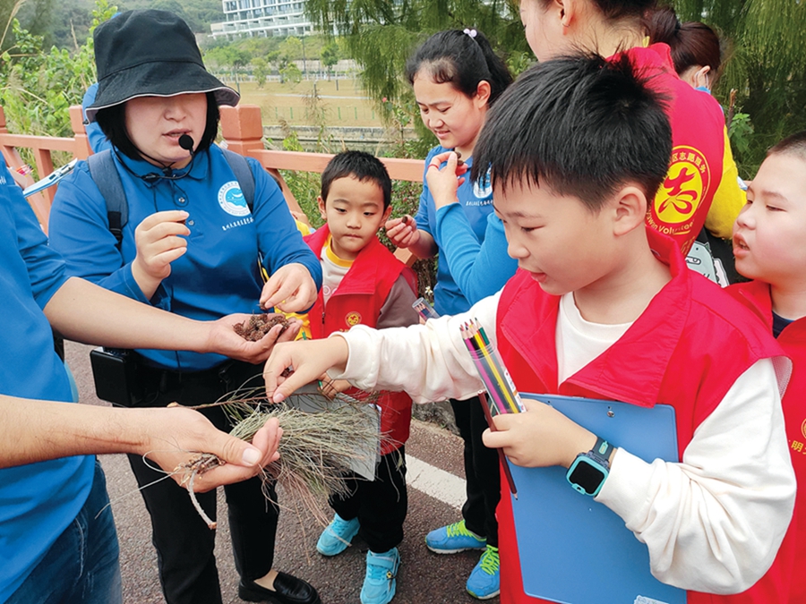 活動(dòng)開始前,帶隊(duì)老師賀談先帶領(lǐng)成員玩起了“破冰游戲”,增進(jìn)彼此的認(rèn)識(shí)。之后,在老師的帶領(lǐng)下,大家沿著海岸線徒步。“紫薇樹在受到外界刺激之后呀,就會(huì)像怕癢癢一樣抖來抖去,所以它又叫癢癢樹……”走進(jìn)烏頭山綠道,老師熱情地為大家介紹紫薇樹、榕樹、黃槿、芒果樹、木麻黃的特征及習(xí)性。“以前走這條路的時(shí)候只是簡(jiǎn)單散步,今天跟著老師一路認(rèn)識(shí)了那么多植物,有一種全新的感受。”參加活動(dòng)的“大朋友”蔣全碧開心地說。