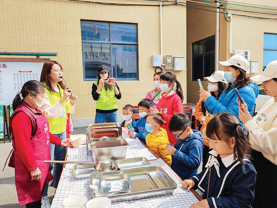“‘漁’你相約,方言會美食”活動現(xiàn)場,村里的美食導(dǎo)師——漁家阿姨們早早準(zhǔn)備好了炒米的食材:茶水、炒米和蘿卜菜,現(xiàn)場散發(fā)著陣陣食物的香氣。美食導(dǎo)師蘇春妹一邊為大家調(diào)制炒米,一邊為村里的孩童們講解炒米的制作和食用步驟。
