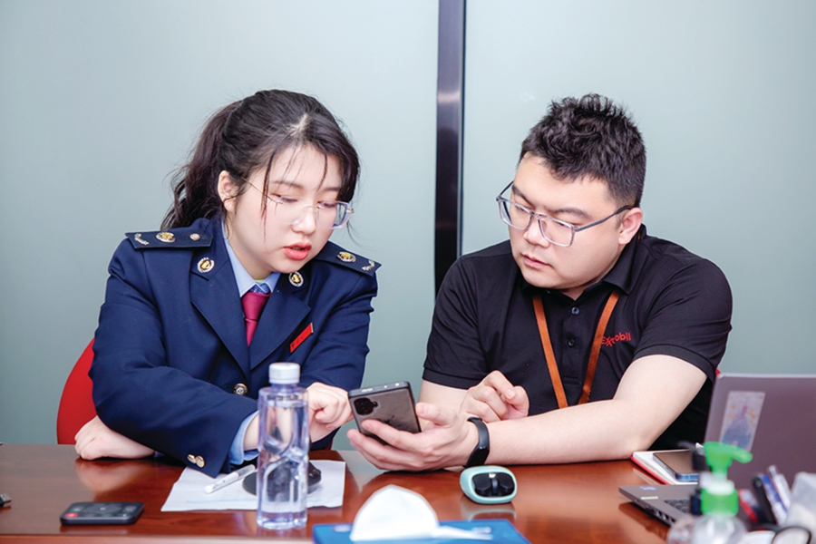 外語助企團隊輔導(dǎo)企業(yè)員工了解稅務(wù)知識。 惠州日報記者曾靜妍 通訊員朱銘 熊一格 攝