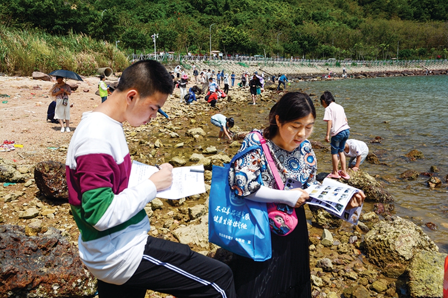 志愿者記錄識(shí)別潮間帶生物。惠州日?qǐng)?bào)記者張宇琪 攝