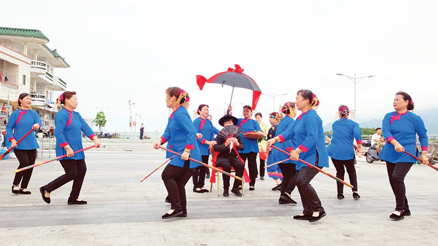 廣場(chǎng)另一邊,一場(chǎng)令人震撼的漁家婚嫁表演上演。“嘿!哈!嘿!哈……”伴隨著劃龍船號(hào)子,村里的漁歌歌舞隊(duì)表演了漁家婚嫁中的“賞花”“拜堂”等環(huán)節(jié)。“新郎”“新娘”“好命人”及劃龍船的“迎親隊(duì)”等角色都由本村漁婦扮演,她們盛裝打扮,一邊表演一邊唱漁歌,原汁原味地展現(xiàn)了漁家婚嫁習(xí)俗的動(dòng)人魅力。現(xiàn)場(chǎng)觀眾紛紛架起“長(zhǎng)槍短炮”和手機(jī)拍攝,沉浸在這場(chǎng)歡快喜慶的節(jié)目中。
