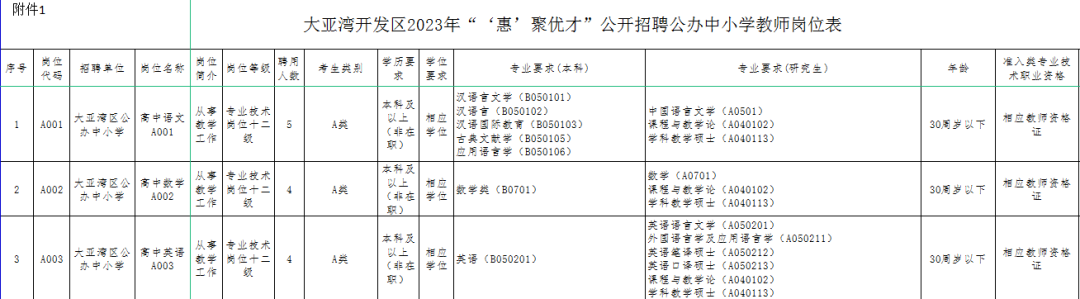 1.大亞灣開發(fā)區(qū)2023年“‘惠’聚優(yōu)才”公開招聘公辦中小學(xué)教師崗位表