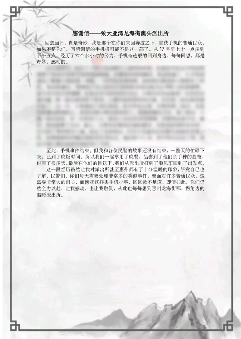 失主林女士的感謝信。最后,范東榮將尋回的手機(jī)交到林女士手中,林女士看到失而復(fù)得的手機(jī)非常激動,大贊澳頭派出所民警的業(yè)務(wù)能力。