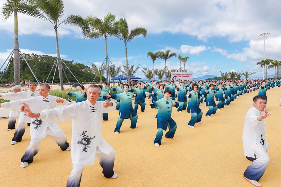 以藍(lán)天白云和沙灘大海為背景,展演隊(duì)伍統(tǒng)一服裝,伴隨著悠揚(yáng)的音樂聲和海浪聲,舒展身姿,開始太極拳、八段錦展演。一招一式間剛?cè)岵?jì)、開合有序、靈動(dòng)輕盈。現(xiàn)場(chǎng)游客也紛紛加入進(jìn)來,跟著節(jié)奏練習(xí)。