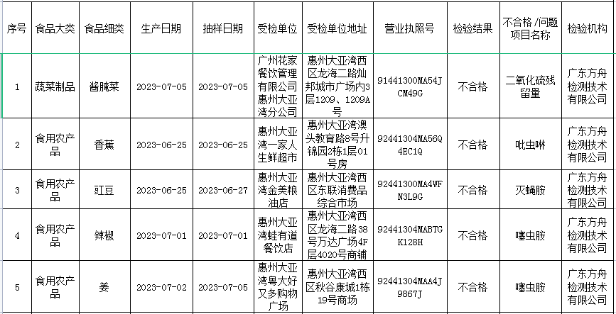 5批次被抽檢為不合格的企業(yè)單位分別為:廣州花家餐飲管理有限公司惠州大亞灣分公司、惠州大亞灣一家人生鮮超市、惠州大亞灣金美糧油店、惠州大亞灣蛙有道餐飲店和惠州大亞灣粵大好又多購物廣場。除花家餐飲公司為蔬菜制品的醬腌菜出現(xiàn)二氧化硫殘留量,其余4家企業(yè)均為食用農(nóng)產(chǎn)品農(nóng)獸藥殘留,香蕉、豇豆、辣椒和姜等被檢測出吡蟲啉、滅蠅胺和噻蟲胺等問題。