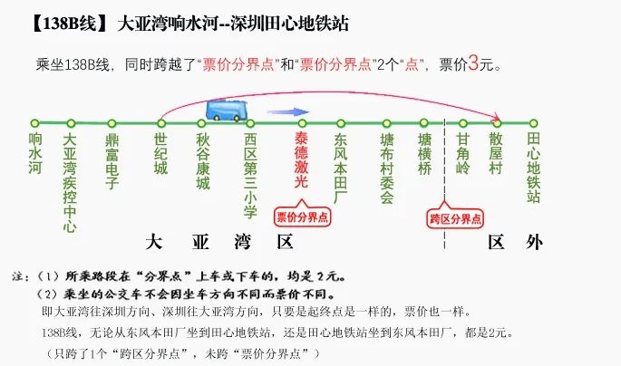 138B線的“跨區(qū)分界點”在大亞灣【塘橫橋】站與深圳【甘角嶺】站之間;“票價分界點”設在【泰德激光】站。