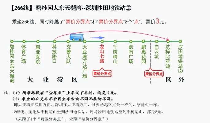 266線的“跨區(qū)分界點”在大亞灣【鵬惠花園】站與惠陽【白云坑】站之間;“票價分界點”設在【龍山七路】站。