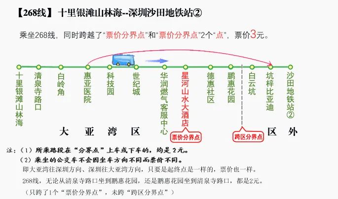 268線的“跨區(qū)分界點”在大亞灣【鵬惠花園】站與惠陽【白云坑】站之間;“票價分界點”設在【星河山水大酒店】站。