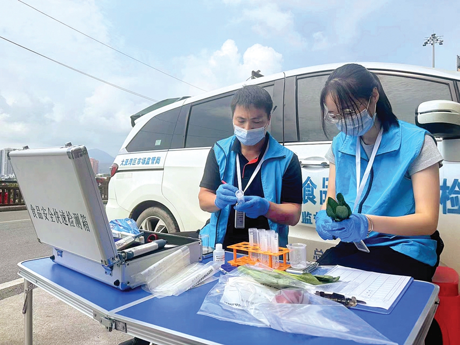 執(zhí)法人員對餐飲單位食材進(jìn)行快速檢測。惠州日報(bào)記者黃旭新 攝