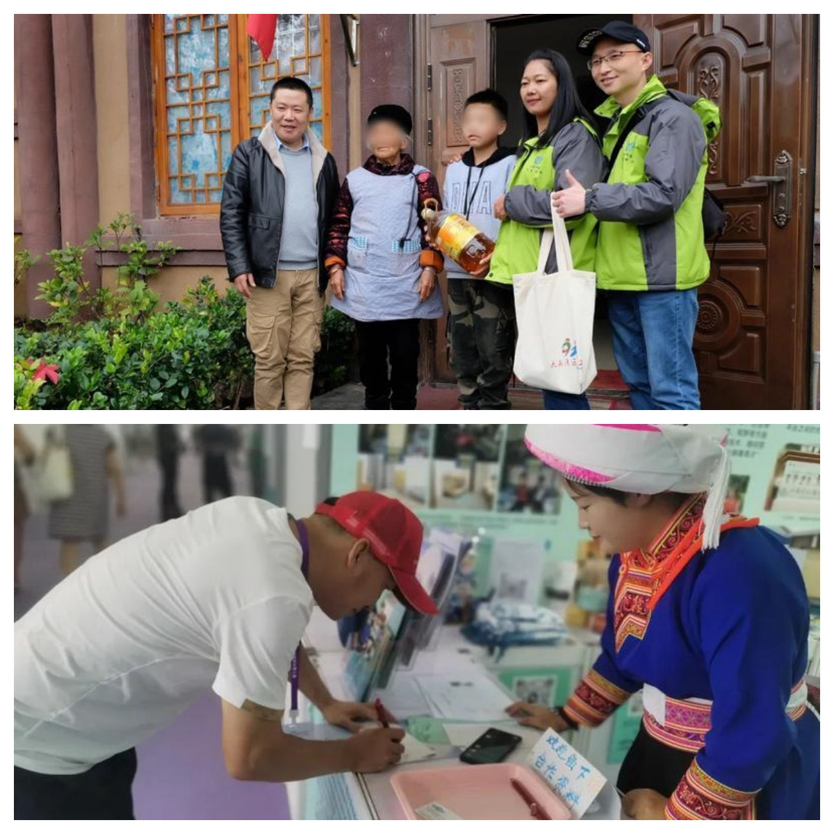 上:滿足老人“微心愿”。 下:現(xiàn)場報(bào)名加入“圓夢大使”。
