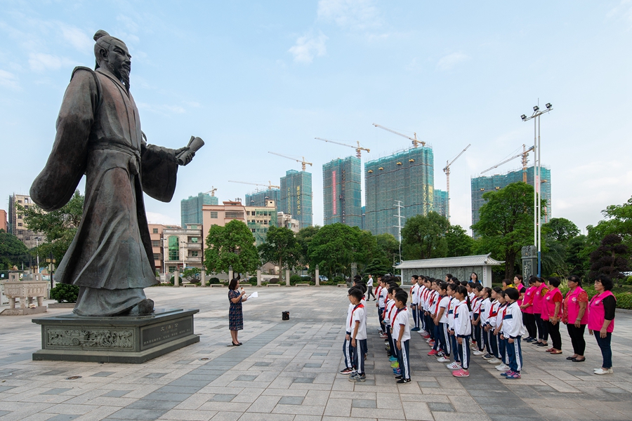 沿著平整的柏油路來到西區(qū)街道塘尾村,巨大的朱熹雕塑、中國傳統(tǒng)《中華二十四孝》碑林立于朱子文化廣場。朱熹的《觀書有感》被制作成石雕擺放在文德庭天井內(nèi)。塘尾村是宋代理學(xué)家、思想家朱熹后人聚居地,迄今已有300多年的歷史。