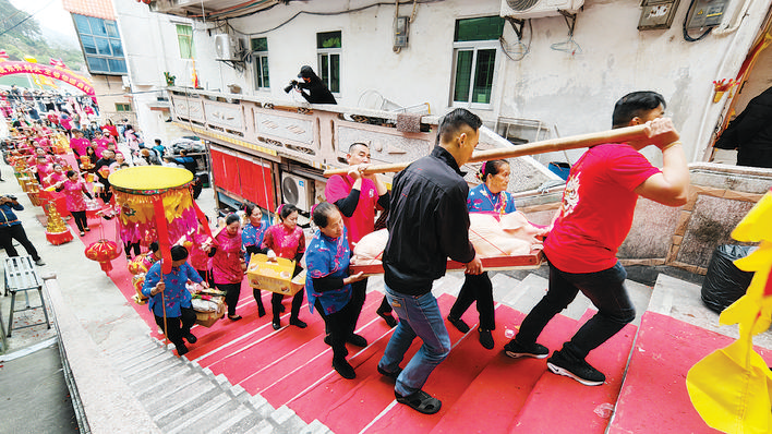 上午8時許,記者一行從澳頭前進(jìn)村碼頭坐快艇前往東升村。走進(jìn)村中,只見防護(hù)堤及村道旁旌旗獵獵、鑼鼓聲聲,整個村子都沉浸在一派歡樂的氛圍里。