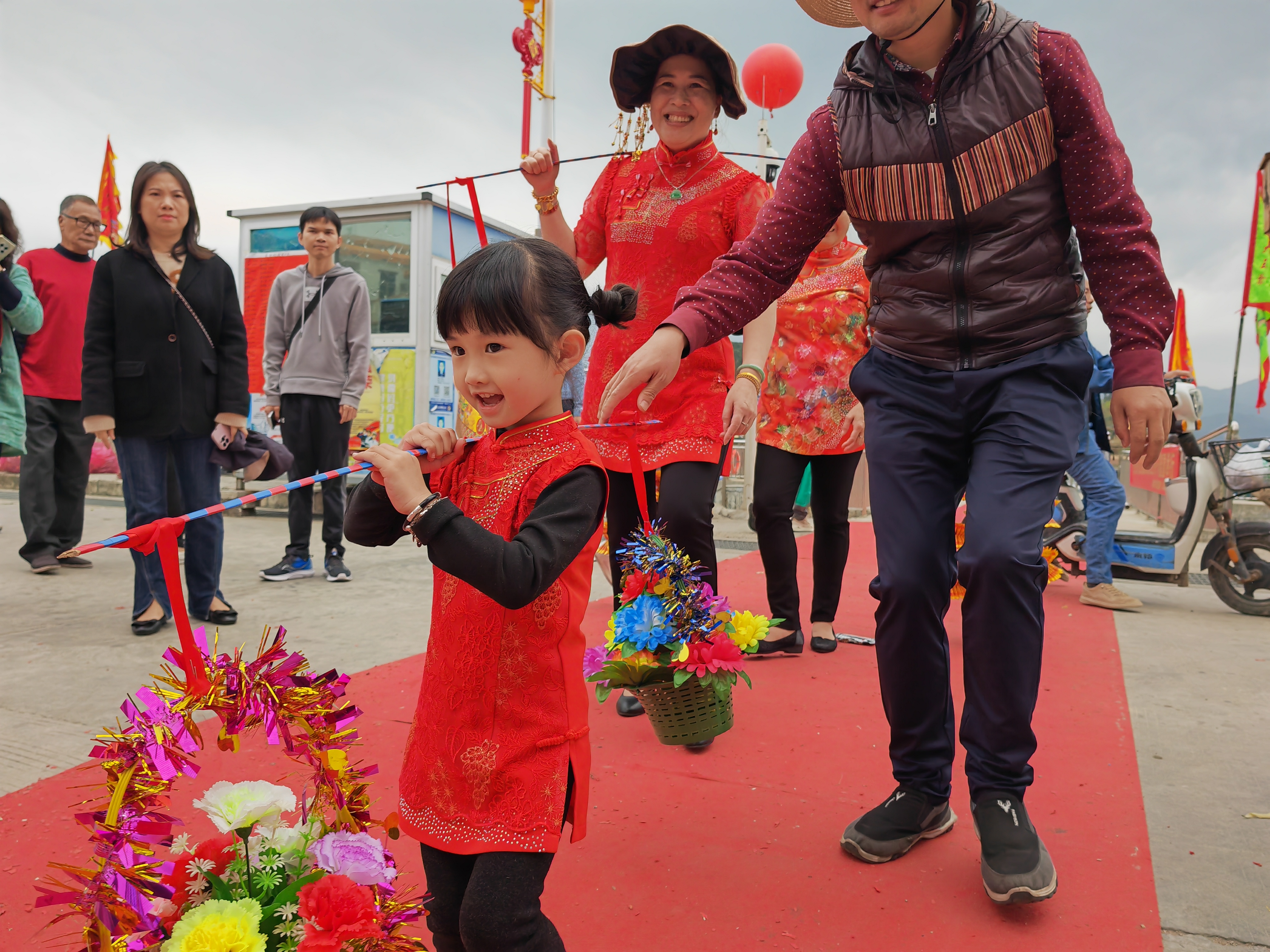 在巡游隊(duì)伍里,一位挑著花籃的小“漁女”吸引了大家的目光。5歲的蘇曉璇第一次跟著家人參加大王爺節(jié),她穿著新做的漁家服飾,扎著兩個小發(fā)髻,跟在隊(duì)伍后面,肩上的花籃上下晃動,很是可愛。“讓她從小就接觸我們的傳統(tǒng)民俗文化,對于她來說是一次難忘的體驗(yàn)。”曉璇的爸爸蘇征兵說。