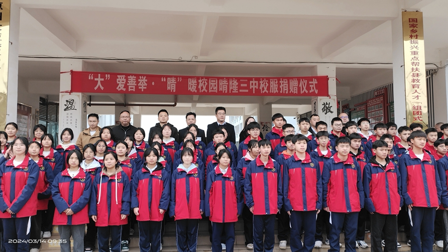 早春時節(jié),晴隆縣還比較寒冷,晴隆縣第三中學2442名學生穿上嶄新的紅藍色相間沖鋒衣,暖在身上,更暖在心上。“這份關(guān)愛和希望不僅僅是物質(zhì)上的幫助,更是一份精神上的鼓勵。我們要努力學習,不僅為了自己的未來,更為了建設(shè)美好的晴隆。”晴隆縣第三中學學生代表張福艷說。