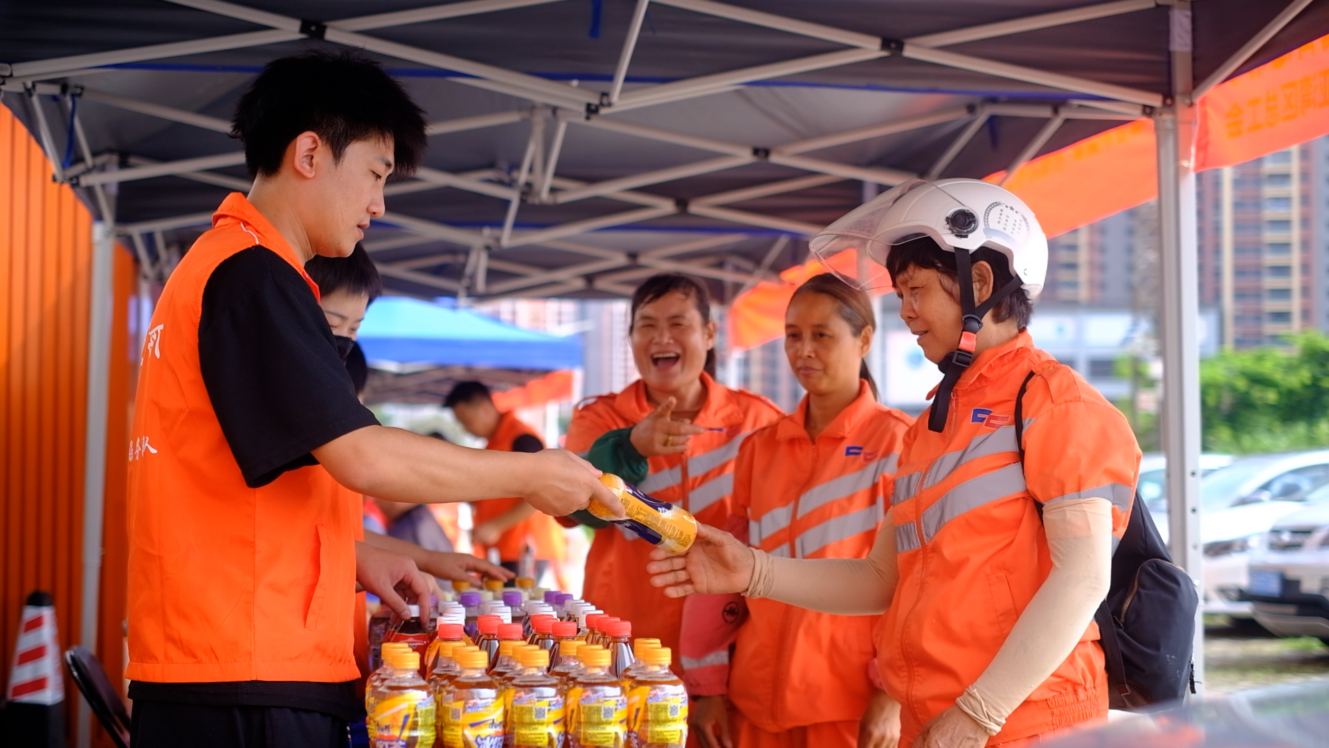 工作人員為戶外勞動者送上消暑飲品。惠州日報記者黃旭新 攝