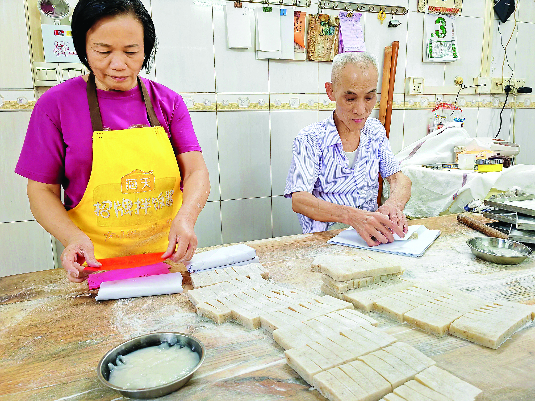 云片糕和月餅一樣,都是霞涌本地中秋節(jié)必備的點(diǎn)心之一。每年中秋節(jié)前一個(gè)月,便陸續(xù)有街坊鄰里或遠(yuǎn)方的客人來劉志忠店里預(yù)訂手工月餅和云片糕。