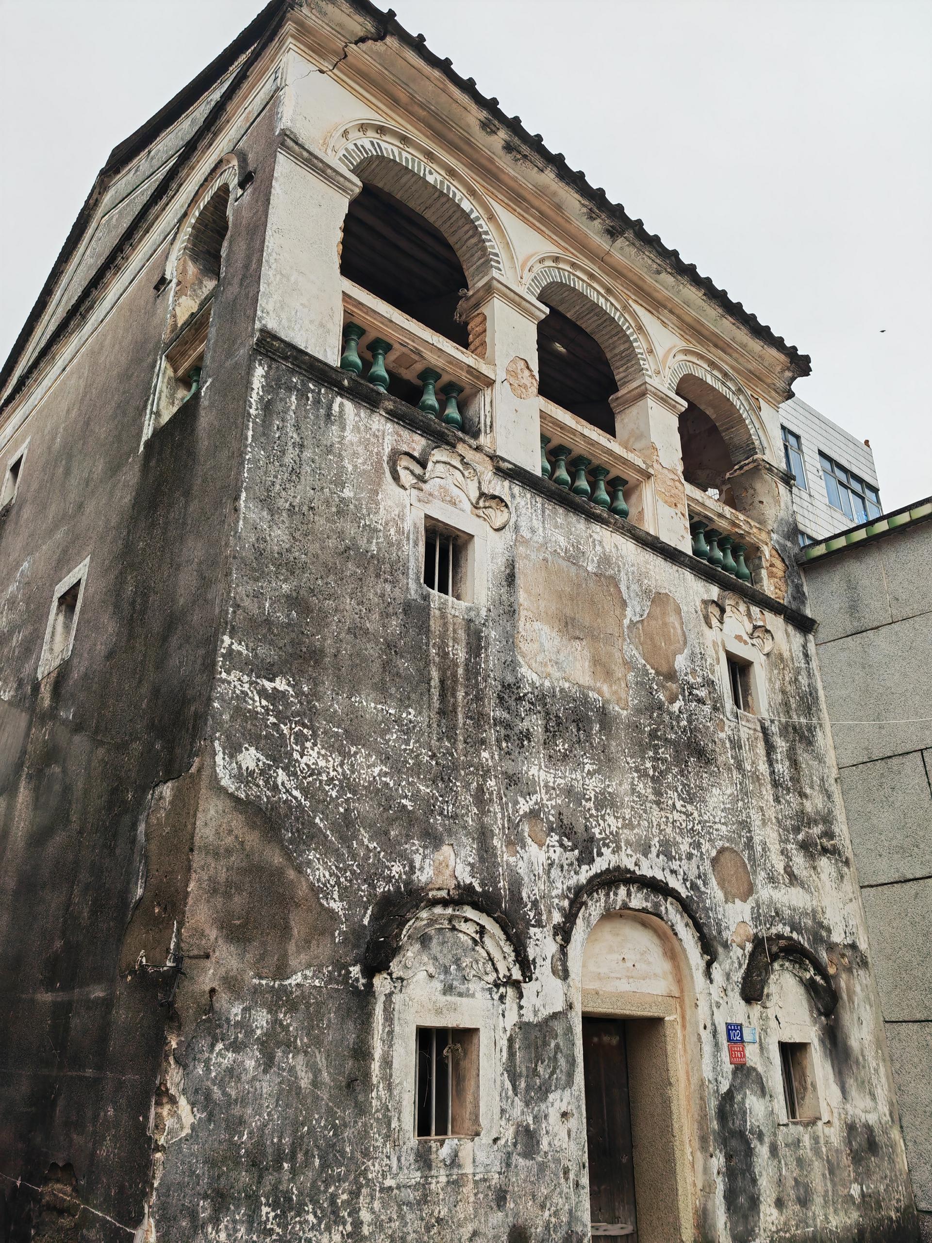 102號“李氏兄弟樓”是一棟3層建筑。最具特色的是第三層為柱廊式三開間,立有4個方墩和3個拱圈,磚拱上方有灰雕裝飾的四瓣花,象征著幸福和喜悅;方墩之間的欄桿為陶瓷綠色瓶式欄桿,非常有嶺南特色。據(jù)村民描述,“李氏兄弟樓”隔壁原有另外一棟房屋,早年出租后發(fā)生火災(zāi)被燒毀。大火也殃及“李氏兄弟樓”,如今其墻身仍有灰黑色痕跡。