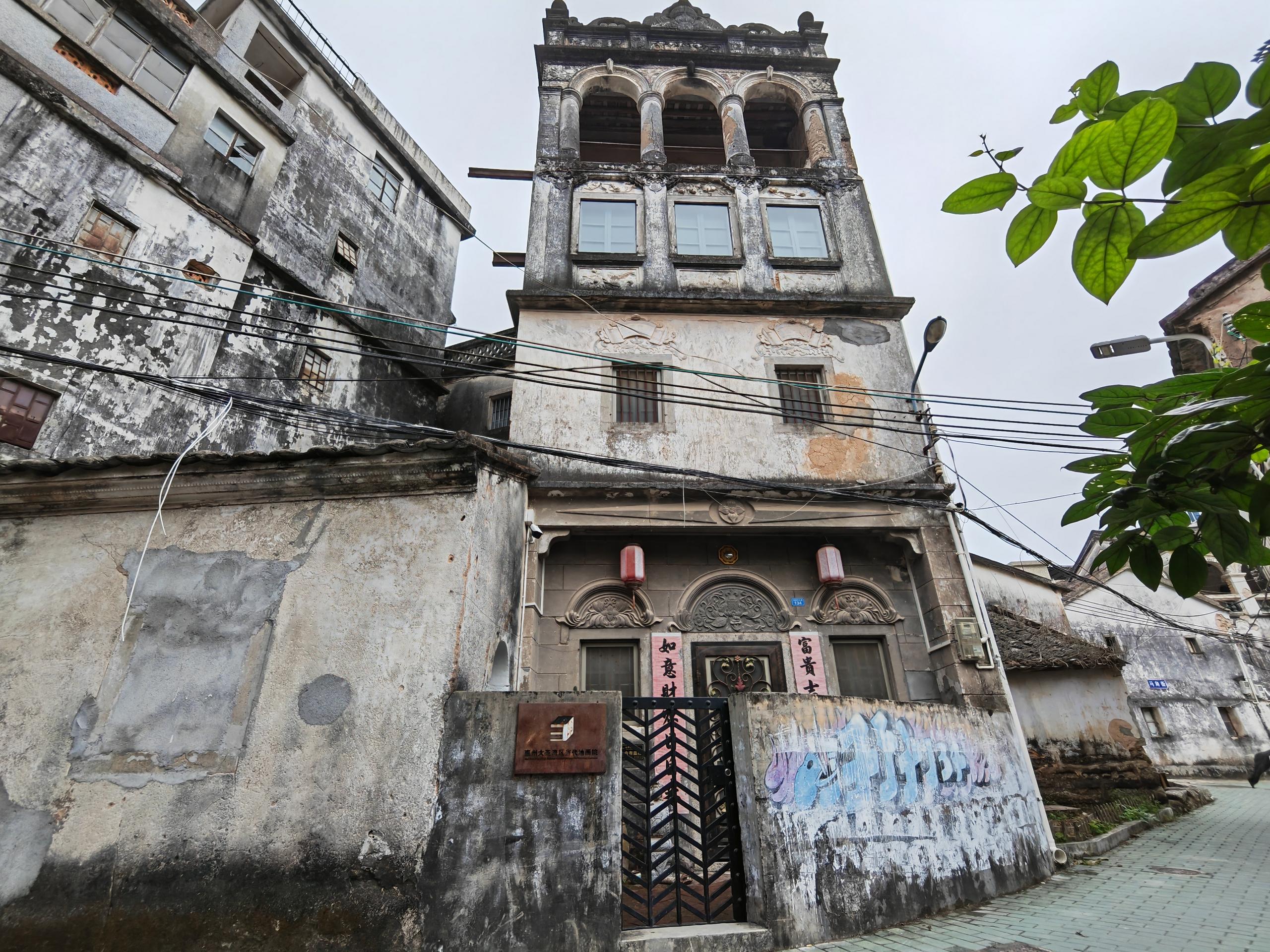 134號“李氏宅居樓”是一處柱廊式4層建筑,磚混結(jié)構(gòu)。建筑既有客家人的圍屋特征,也有中西結(jié)合的影子:入口處矮墻圍合出一個小院;一層三個門窗是西洋風(fēng)格的拱圈,拱圈內(nèi)裝飾浮雕為中式的荷花、喜字等圖案。幾年前,大亞灣開發(fā)區(qū)當(dāng)代油畫院院長李子行將這座老建筑接手過來“修舊如舊”,打造成“惠州大亞灣區(qū)當(dāng)代油畫院”。如今該建筑也成為村里吸引游客、文旅融合的新亮點(diǎn)。