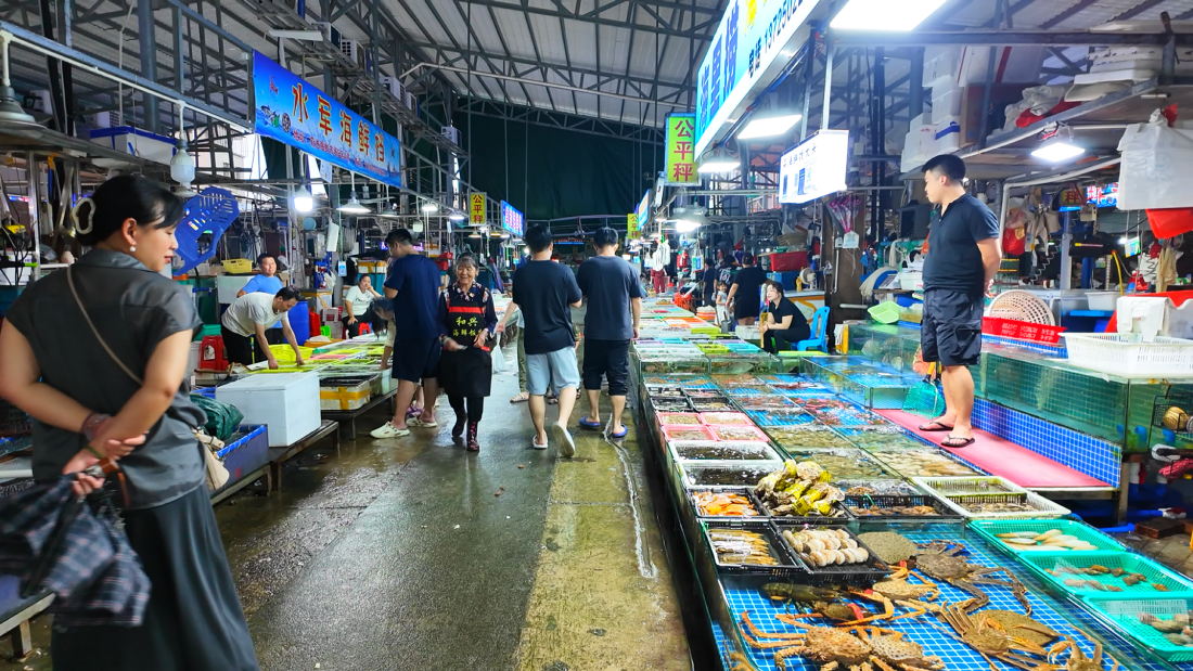 在澳頭金門塘碼頭,每天凌晨兩點都迎來漁船靠岸卸貨的繁忙時刻。漁貨上岸后便立刻送往碼頭上的大亞灣泰潤海產(chǎn)品市場售賣,大量的海鮮收購商和消費者在這里交易,一輛輛裝載著新鮮海產(chǎn)品的大貨車來回穿梭,駛向各個零售市場和食肆。市場管理方溫先生表示:“開漁后市場迎來了銷售高峰期,我們預(yù)留了足夠的停車空間,并保證充足的照明,方便大家順利交易和上貨。”