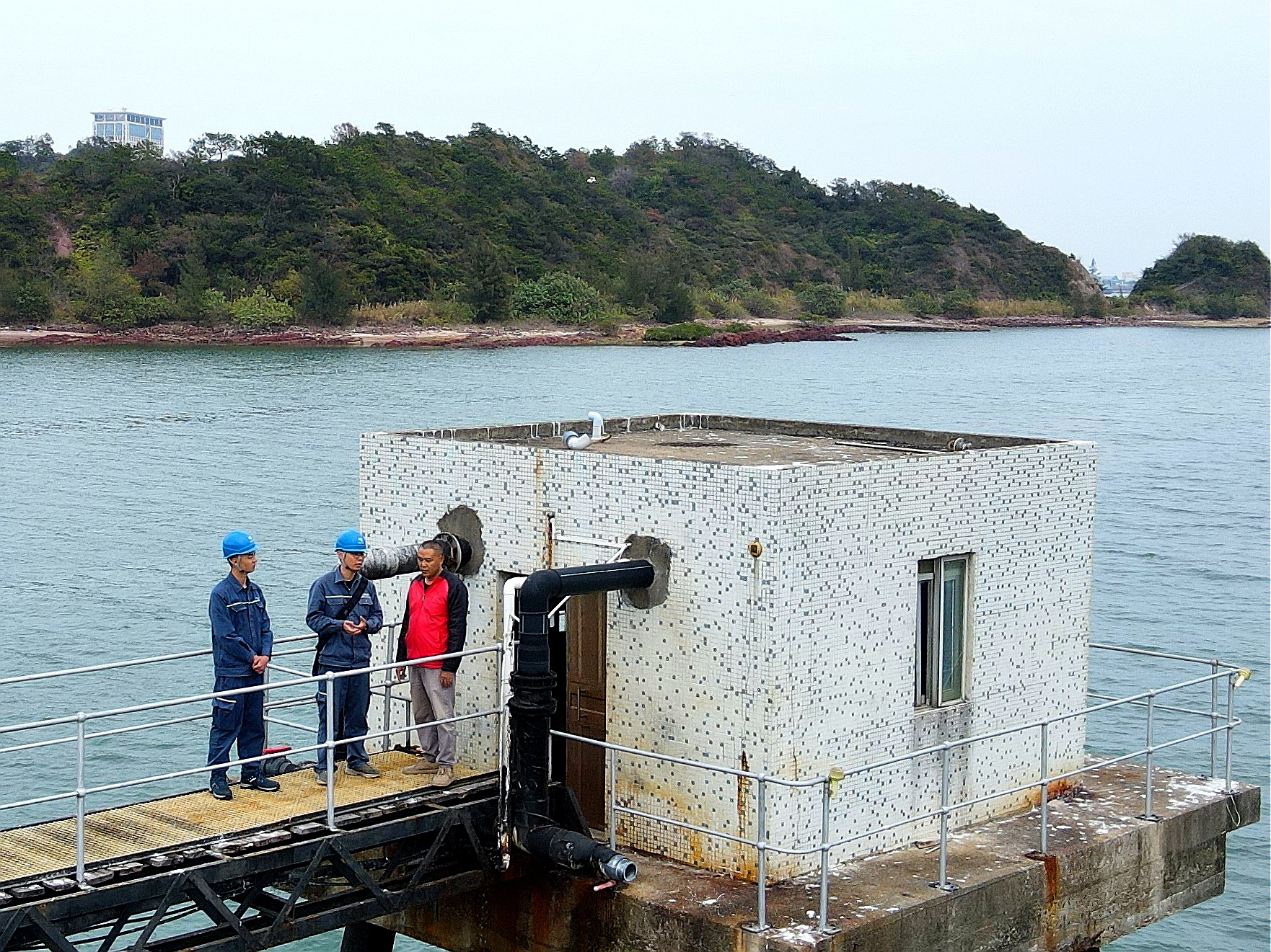 惠州大亞灣供電局客戶經(jīng)理向海洋漁業(yè)試驗基地工作人員了解科研用電情況。