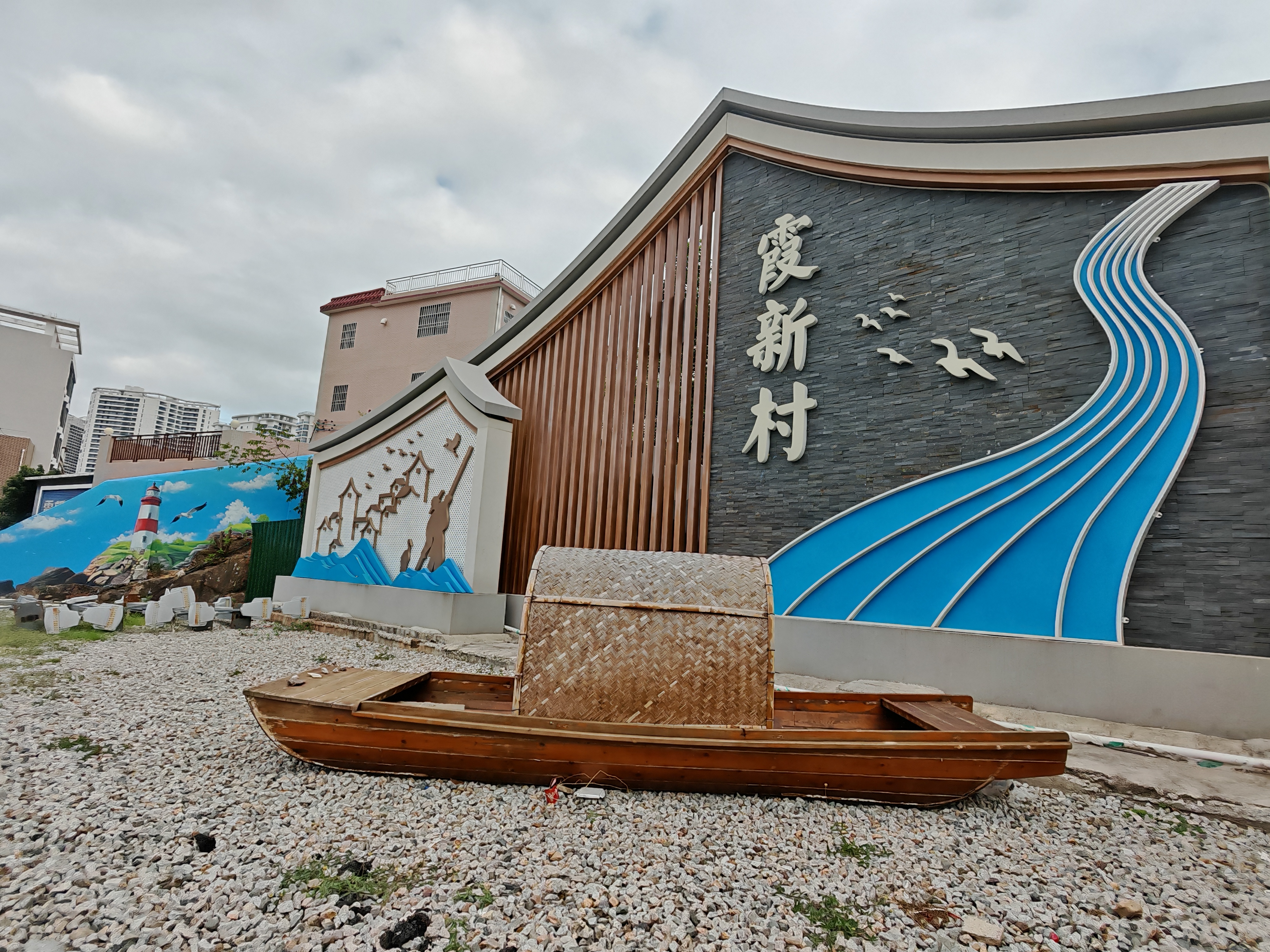 沿著海韻廣場穿過霞新橋,霞新村螺島下的入口處率先帶來驚喜。這里新添了一處醒目的村莊標(biāo)識,整體風(fēng)格以藍(lán)白灰黃為主色調(diào),旁邊的山墻則巧妙畫上了漁村特色墻繪——燈塔矗立、海鳥翩飛。現(xiàn)場還特意擺放了一艘漁船模型,與墻體彩繪相映成趣,還原了傳統(tǒng)漁村的質(zhì)樸風(fēng)貌。而旁邊的登山步道則被巧妙設(shè)計成鋼琴鍵造型,搭配“好好生活、慢慢遇見”“喜歡你的,就叫你霞涌”等暖心文案,讓每一步前行都充滿儀式感。