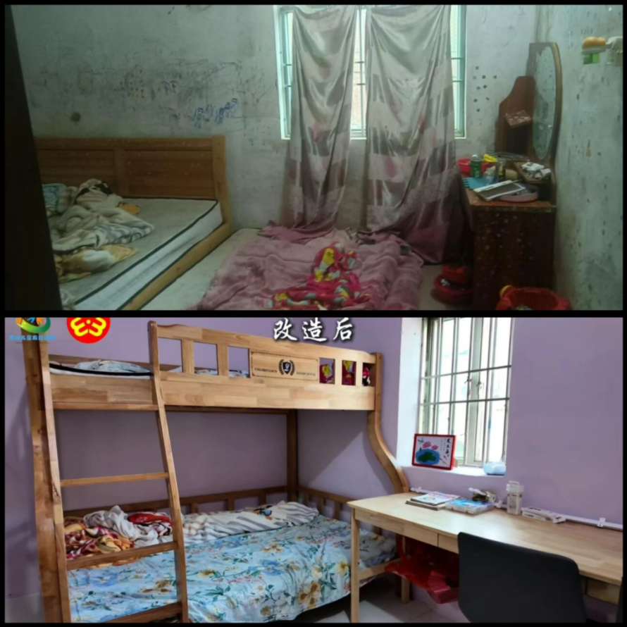 針對(duì)這些實(shí)際問(wèn)題,改造團(tuán)隊(duì)用心改造:為小雨家修補(bǔ)墻面、更換窗戶(hù)與上下床,添置書(shū)桌衣柜;給小星家的房間刷白煥新,配齊床品與學(xué)習(xí)用具;為小年家搭建輕便隔墻,劃分出獨(dú)立學(xué)習(xí)區(qū)——通過(guò)細(xì)心改造,為孩子們創(chuàng)造了一個(gè)良好的居住、學(xué)習(xí)和個(gè)人生活空間,實(shí)現(xiàn)空間與兒童心理的雙重?zé)ㄐ隆?
